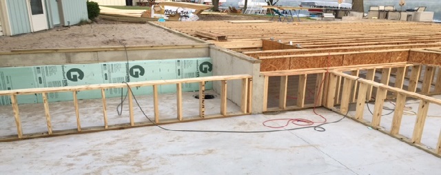 The floor framing is TJI pre-engineered wood floor joists. The foundation wall uses a reverse brick ledge to support the wood floor joists. The second floor framing is also TJIs. The finish floor of the new home aligns with the finish floor of the existing garage, and is not too much above the grade of the lot. The house is designed with Universal Design principles and is fully accessible by wheel chair should the need ever arise.
