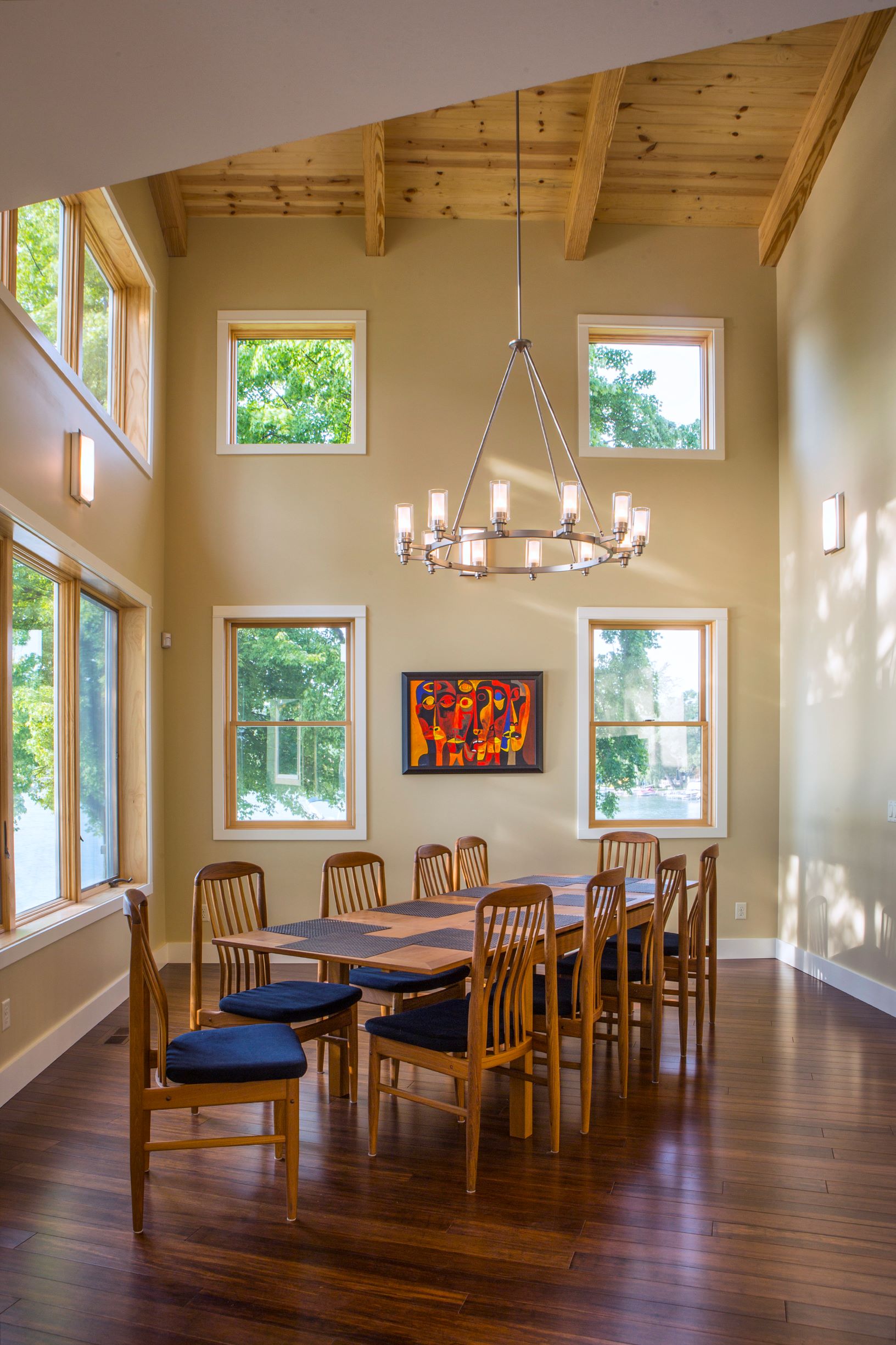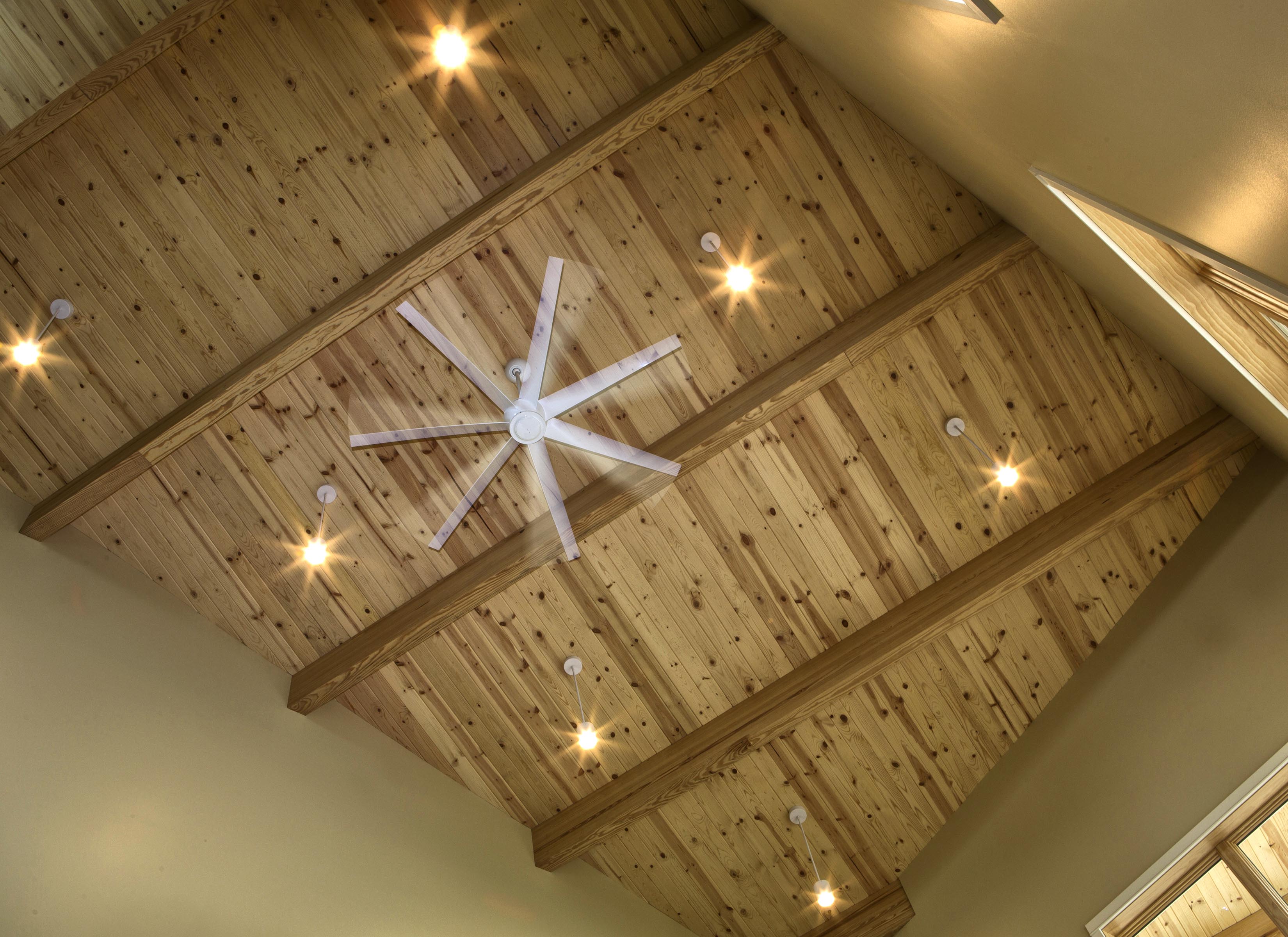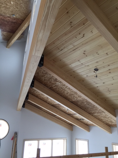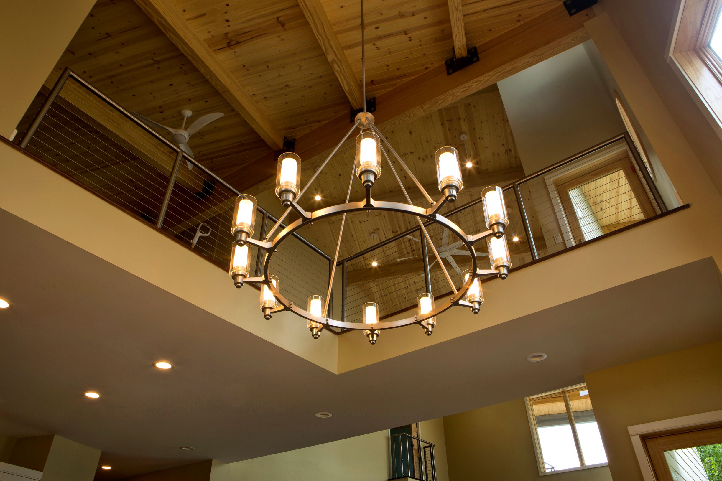 Interior must also be comfortable and beautiful. The design is clean, dynamic and modern leaning, but warm and comfortable at the same time. Most of the residence has bamboo wood floors (a rapidly renewable product), T&G pine ceilings, exposed glue-lam beams, some exposed steel, stainless steel and aircraft cable railing systems, and travertine finished custom showers with frameless glass enclosures. We salvaged the knotty cedar wood plank interior for the original 1950’s era cottage that was demolished, and are re-using the material inside the new residence. The spirit of the original cottage lives on for future generations to enjoy and to remember the history of the site.