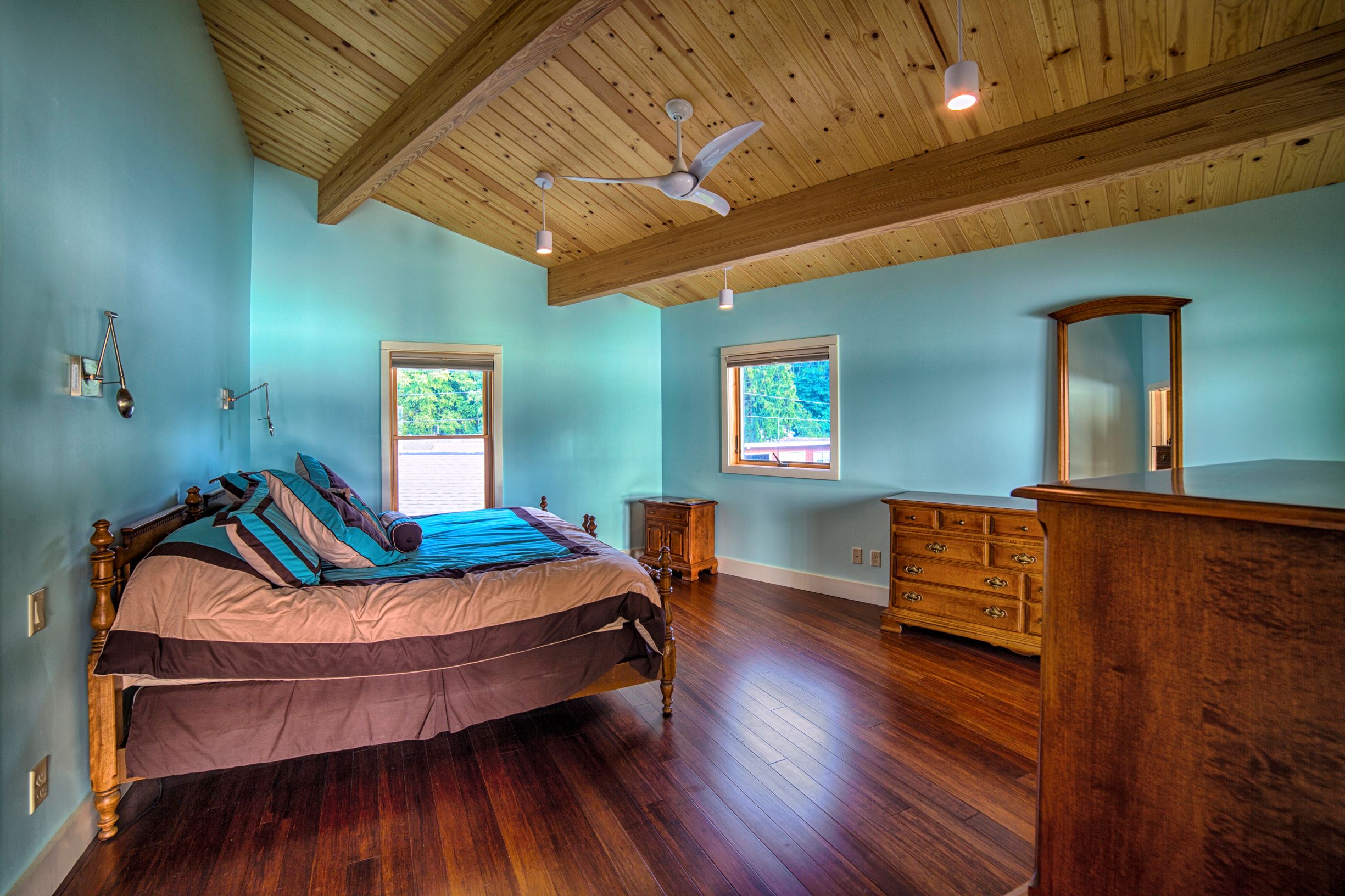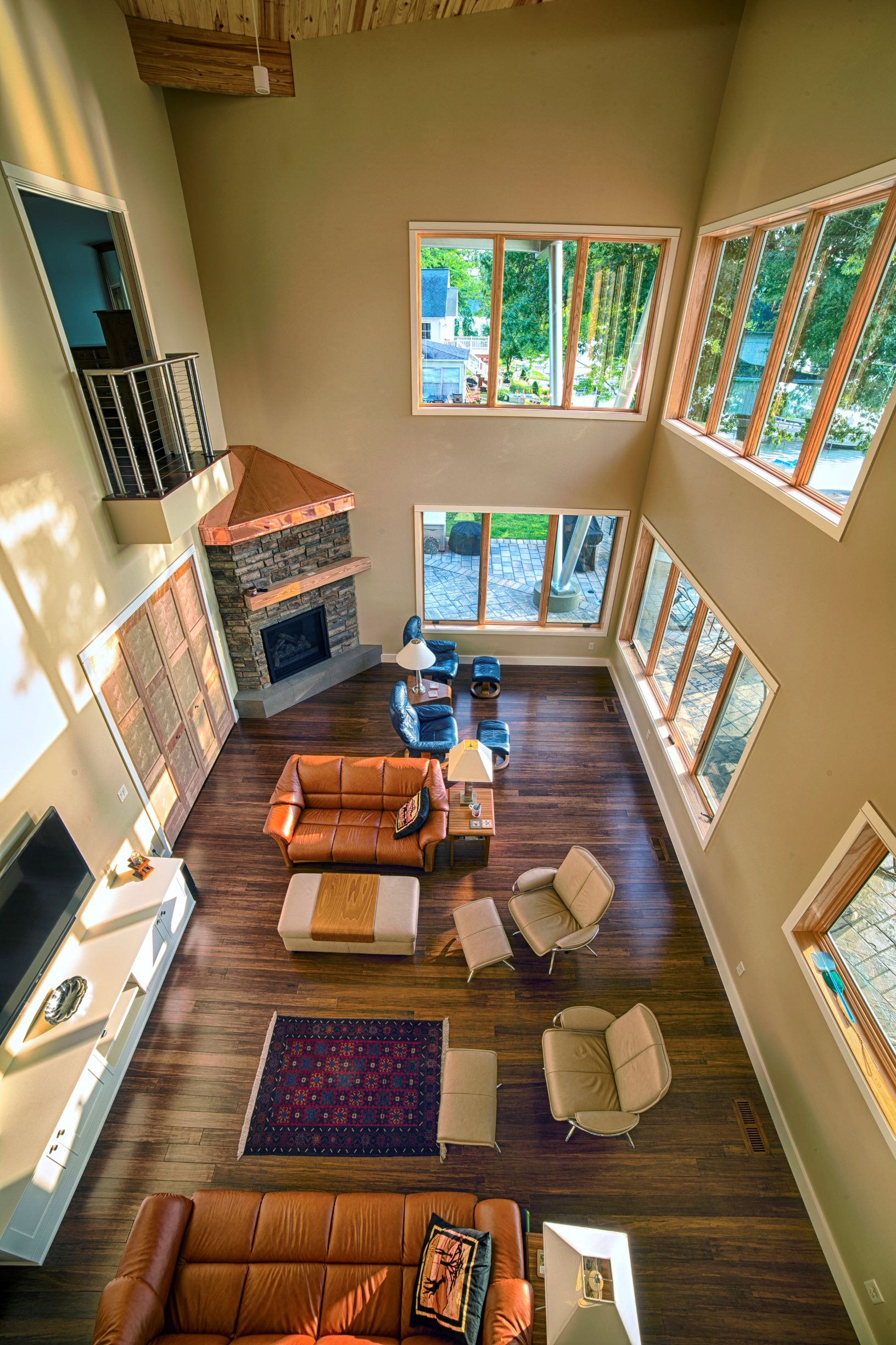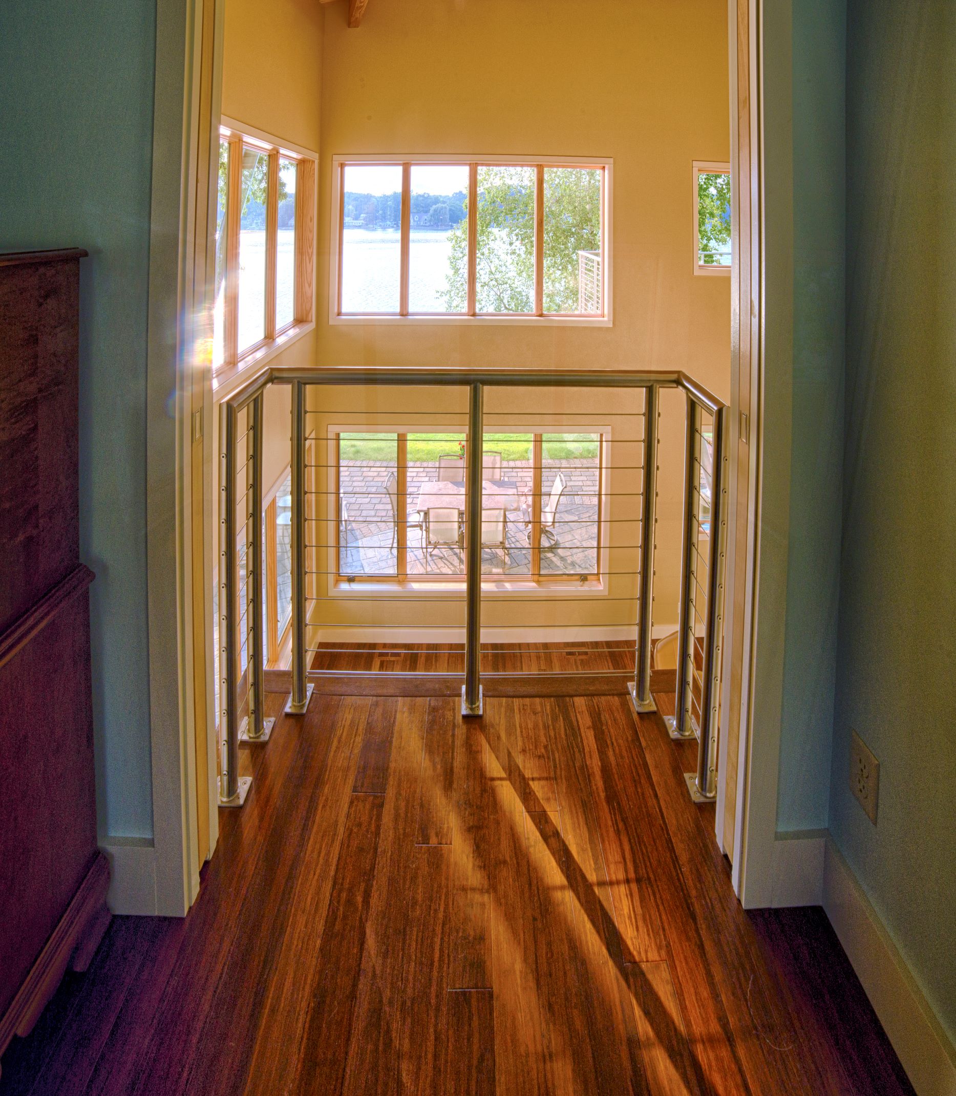 Interior must also be comfortable and beautiful. The design is clean, dynamic and modern leaning, but warm and comfortable at the same time. Most of the residence has bamboo wood floors (a rapidly renewable product), T&G pine ceilings, exposed glue-lam beams, some exposed steel, stainless steel and aircraft cable railing systems, and travertine finished custom showers with frameless glass enclosures. We salvaged the knotty cedar wood plank interior for the original 1950’s era cottage that was demolished, and are re-using the material inside the new residence. The spirit of the original cottage lives on for future generations to enjoy and to remember the history of the site.