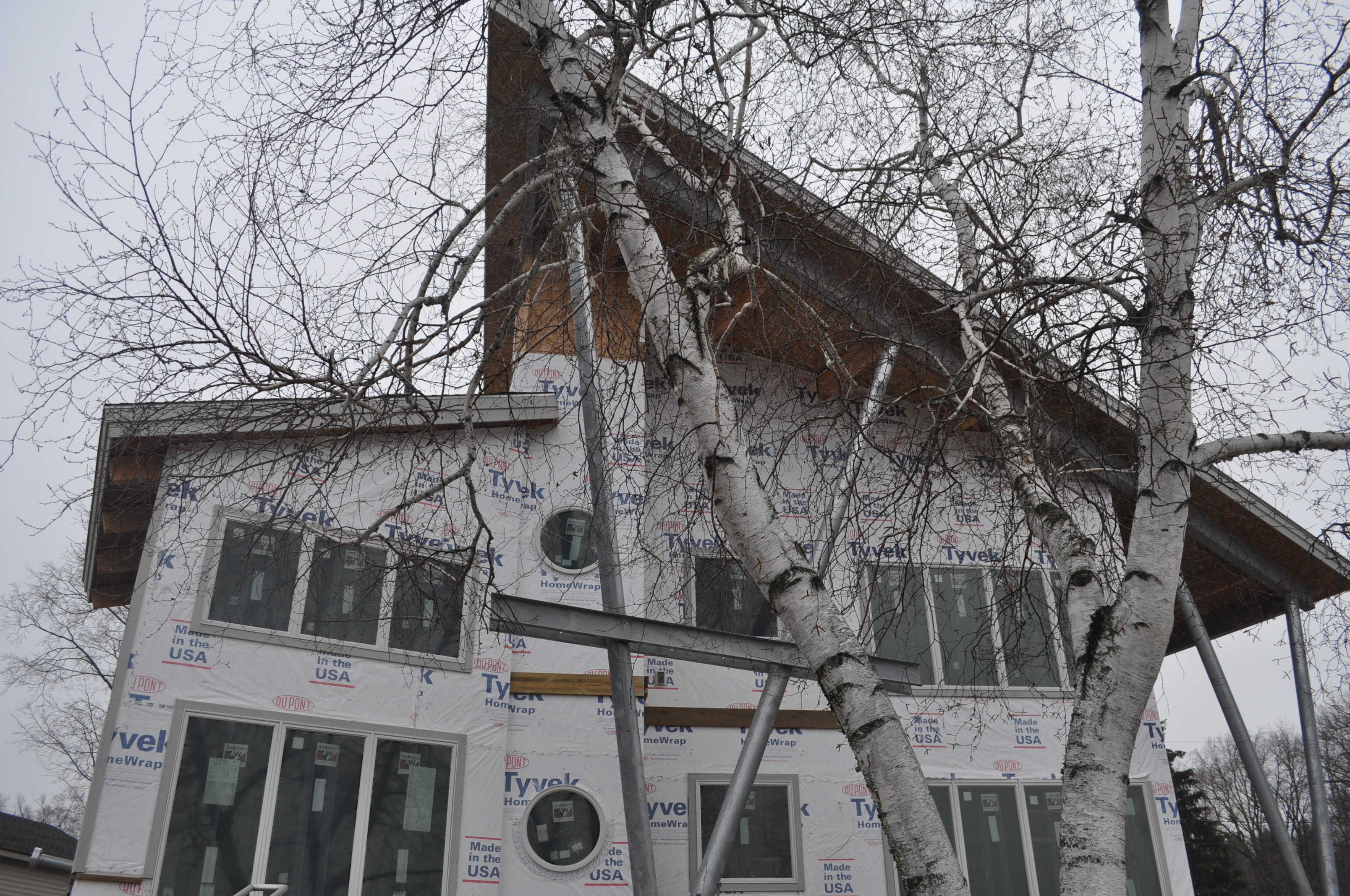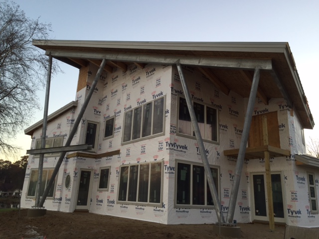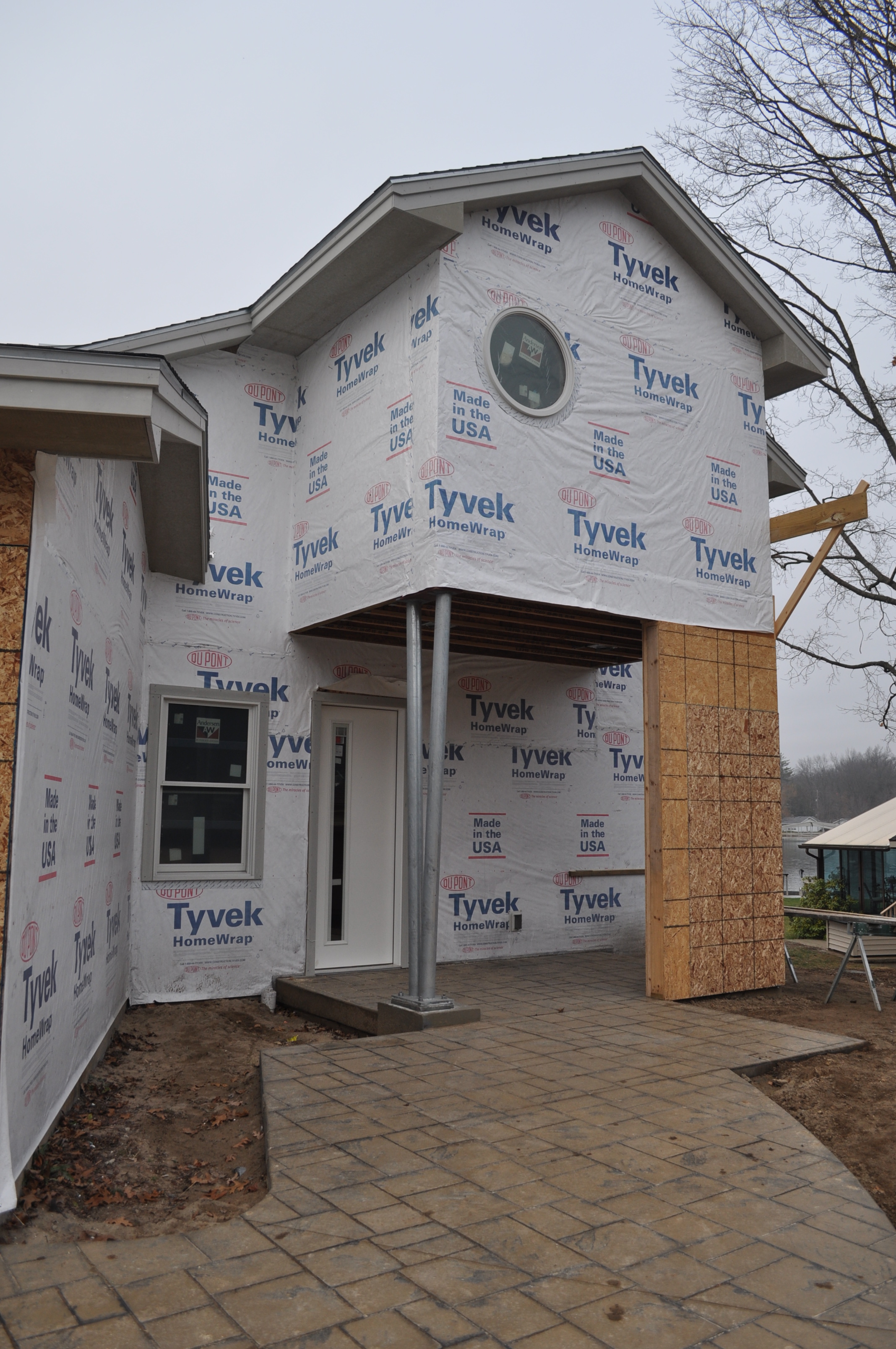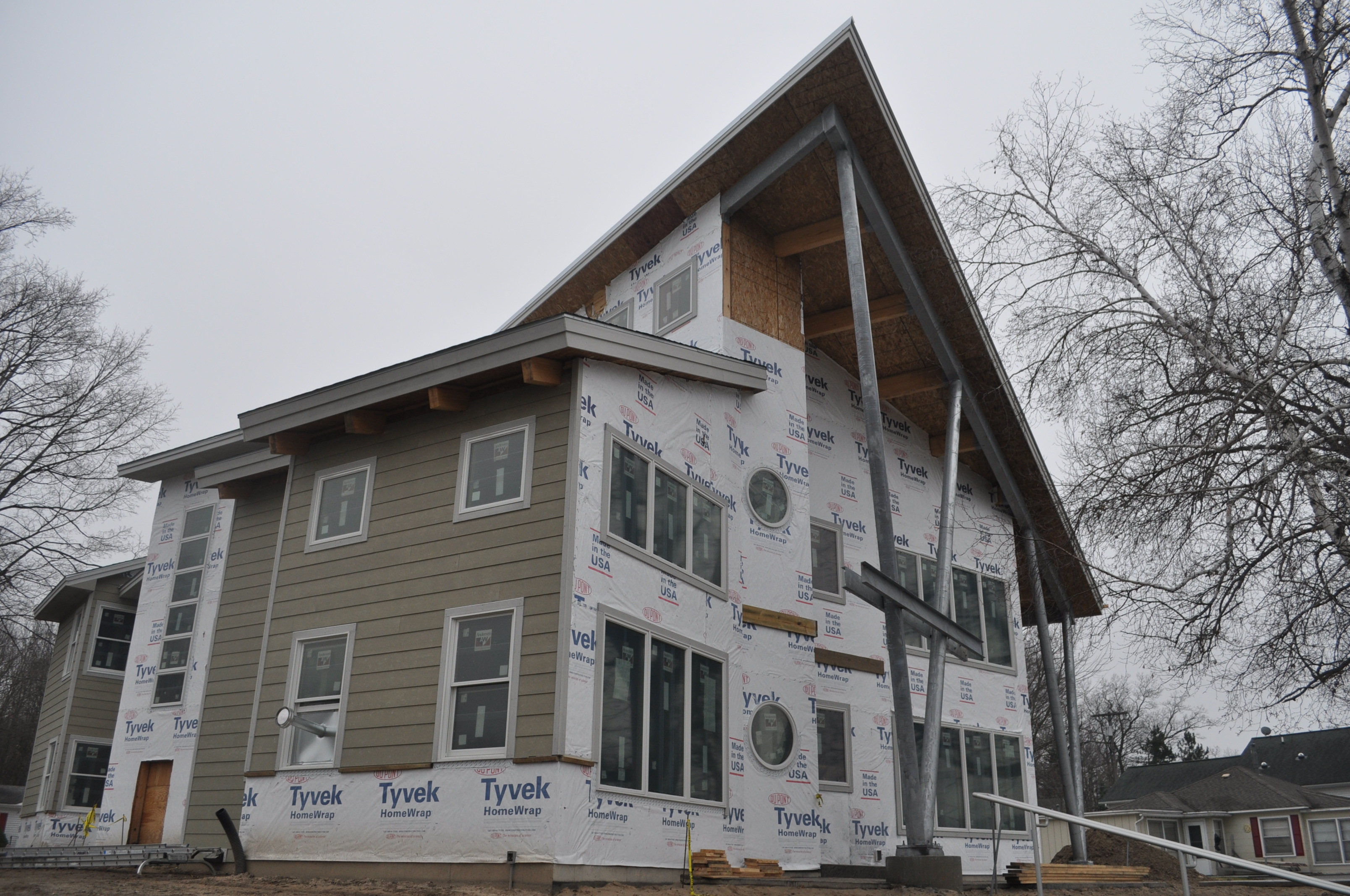 On the interior, the drywall is mounted directly to the SIPS, and on the exterior, the moisture barrier (Tyvek) is applied first and then covered in Hardie Plank cementitious horizontal siding. The windows are Andersen, low-e high performance windows. The main roof where the solar panels will be installed is standing seam metal roofing by Firestone (Una-Clad). The balance of the home and garage are dimensional shingles by CertainTeed. The stair tower is clad in exterior metal wall panels by Dri-Design. The finish is copper anodized. The stonework is Boral Stone veneer. The existing garage got a roof over with pre-engineered wood trusses.
