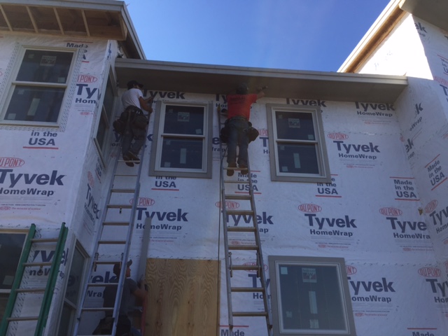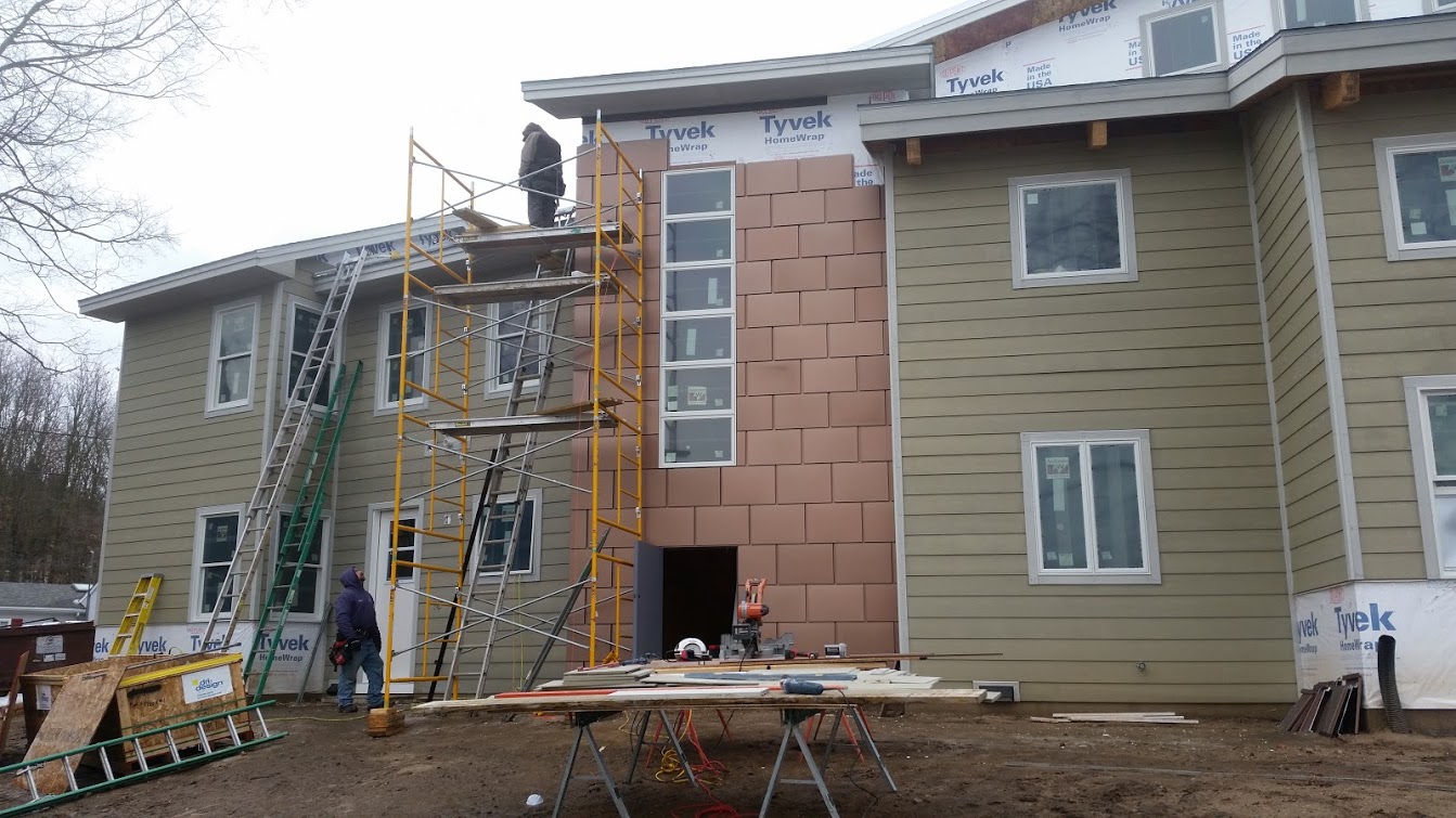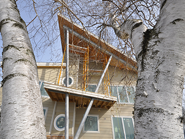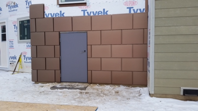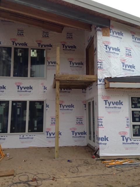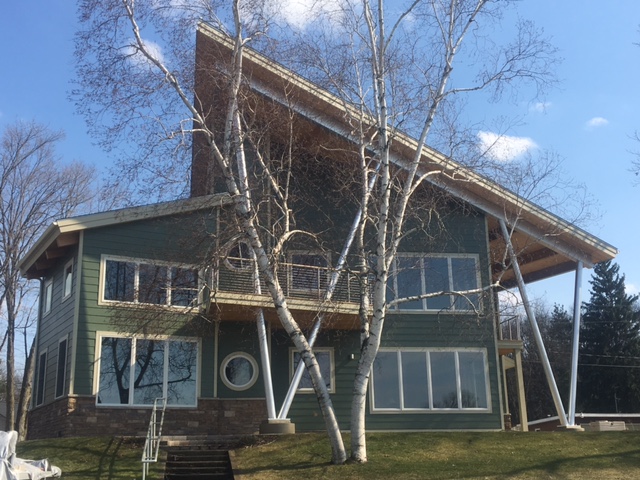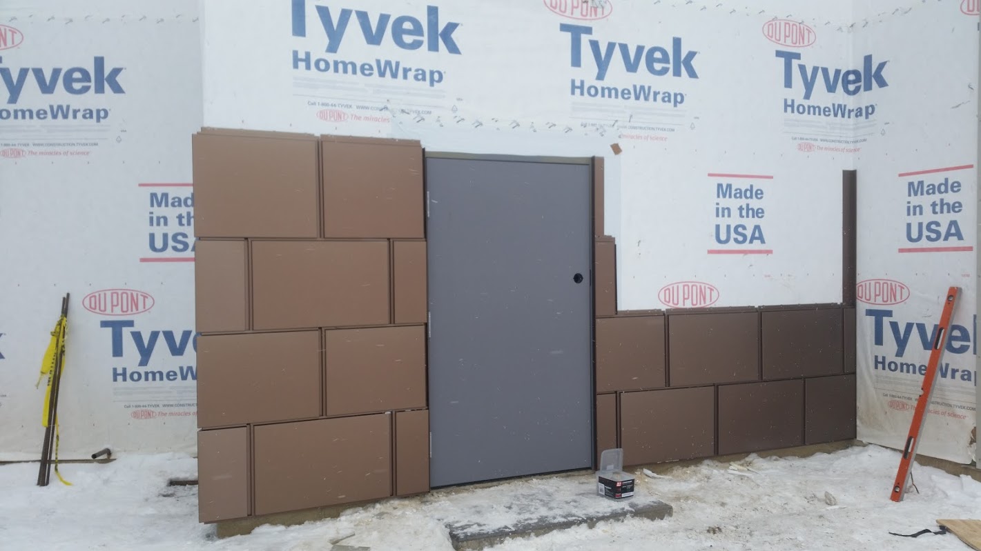 On the interior, the drywall is mounted directly to the SIPS, and on the exterior, the moisture barrier (Tyvek) is applied first and then covered in Hardie Plank cementitious horizontal siding. The windows are Andersen, low-e high performance windows. The main roof where the solar panels will be installed is standing seam metal roofing by Firestone (Una-Clad). The balance of the home and garage are dimensional shingles by CertainTeed. The stair tower is clad in exterior metal wall panels by Dri-Design. The finish is copper anodized. The stonework is Boral Stone veneer. The existing garage got a roof over with pre-engineered wood trusses.