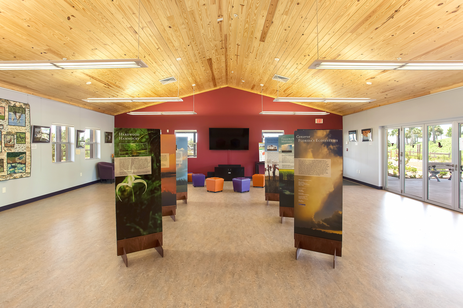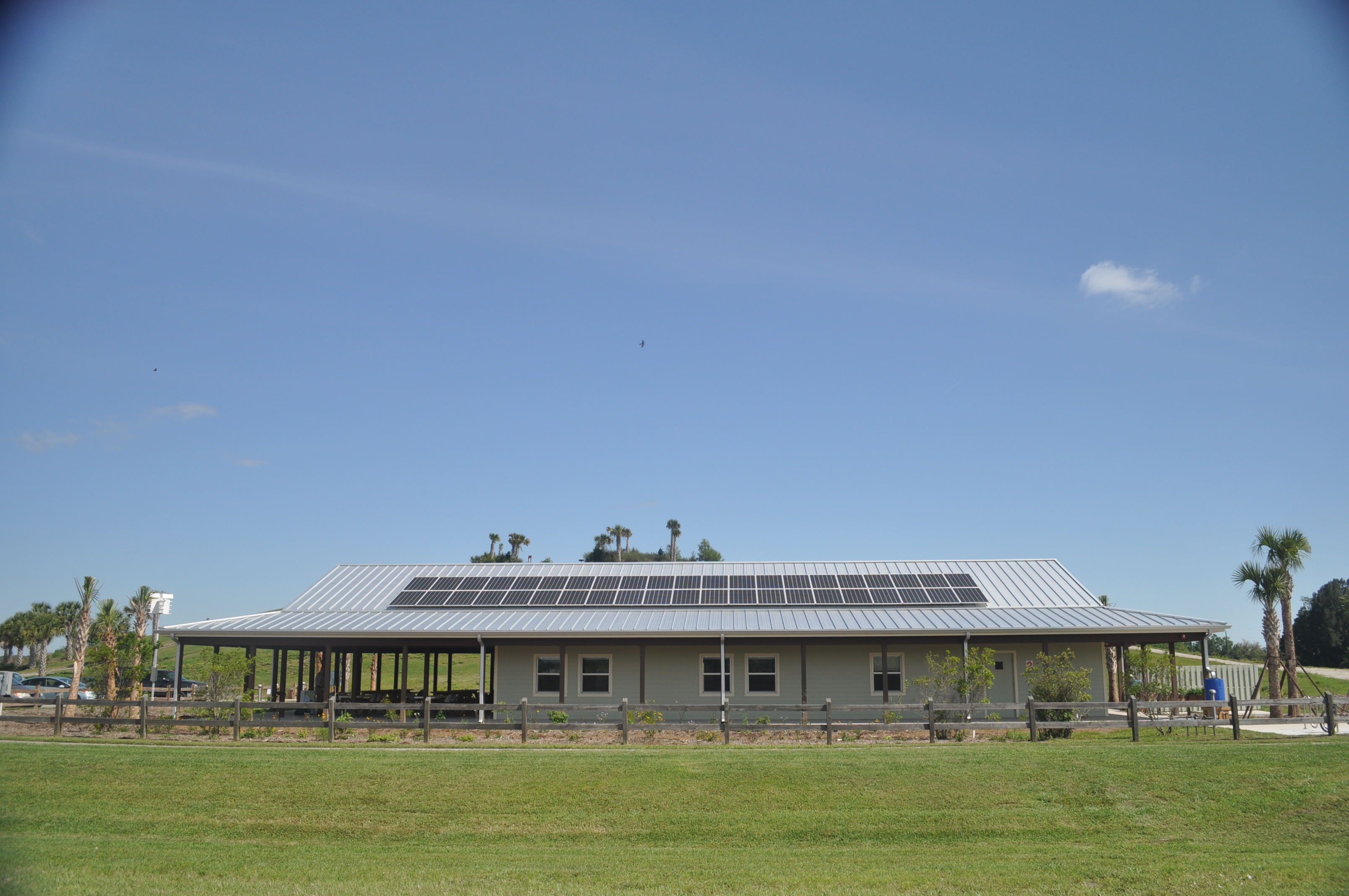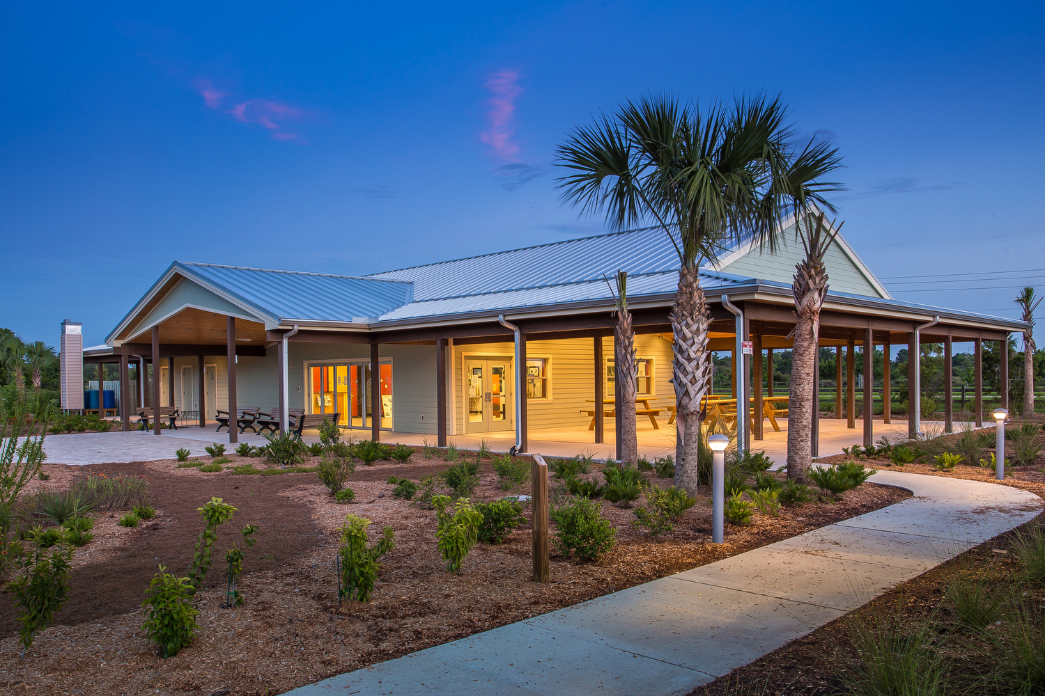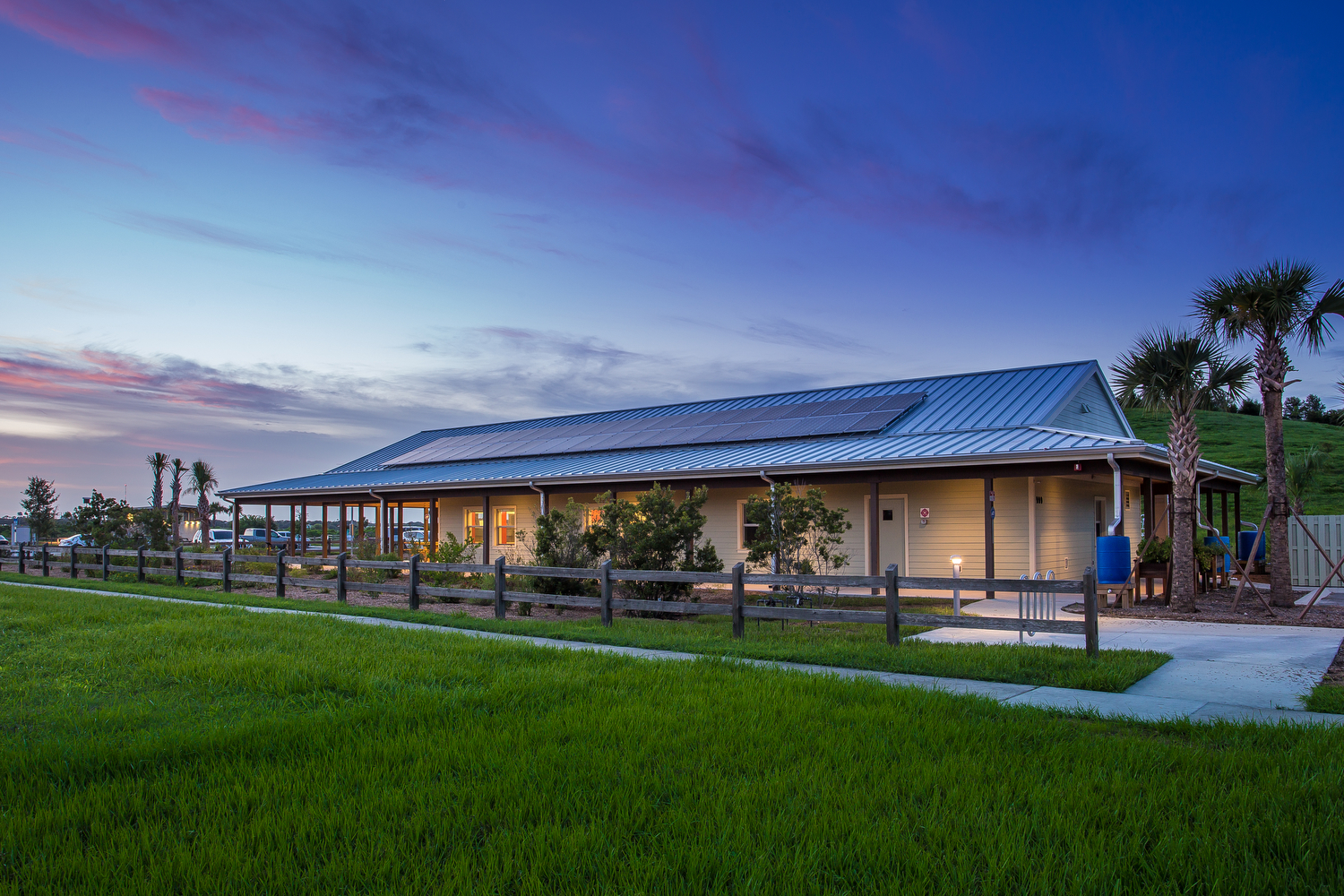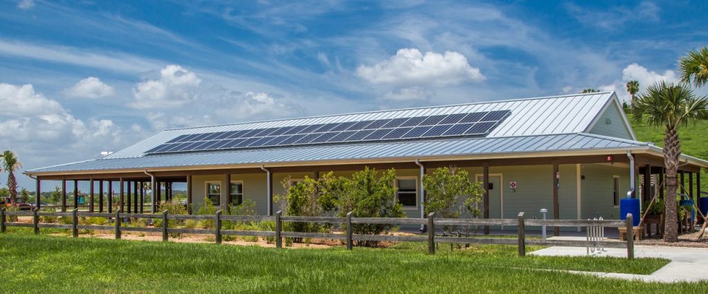 Audubon Nature Center is the next generation of Green Building Design. Since its opening in the fall of 2015, it has been performing as a Net Zero Energy building. The building is designed as a secondary, non-focal shelter/initiation point for learning about the birds and wildlife within the surrounding 360+ acres of the Celery Fields ecosystems. A large wrap around porch expands on the west end to serve as an outdoor classroom space. An indoor lecture room with vaulted wood ceiling, holding up to 40 people, is used for classes, meetings and various functions. The building has the feel of an Old Florida rural home with clapboard siding, tin roof, and the wide shaded porch completely surrounding the facility, inviting visitors to relax and soak in the nature surrounding them. The soft-spoken building provides a platform for achieving harmony relating to nature’s diversity. The project achieved LEED-NC Gold certification through the USGBC.