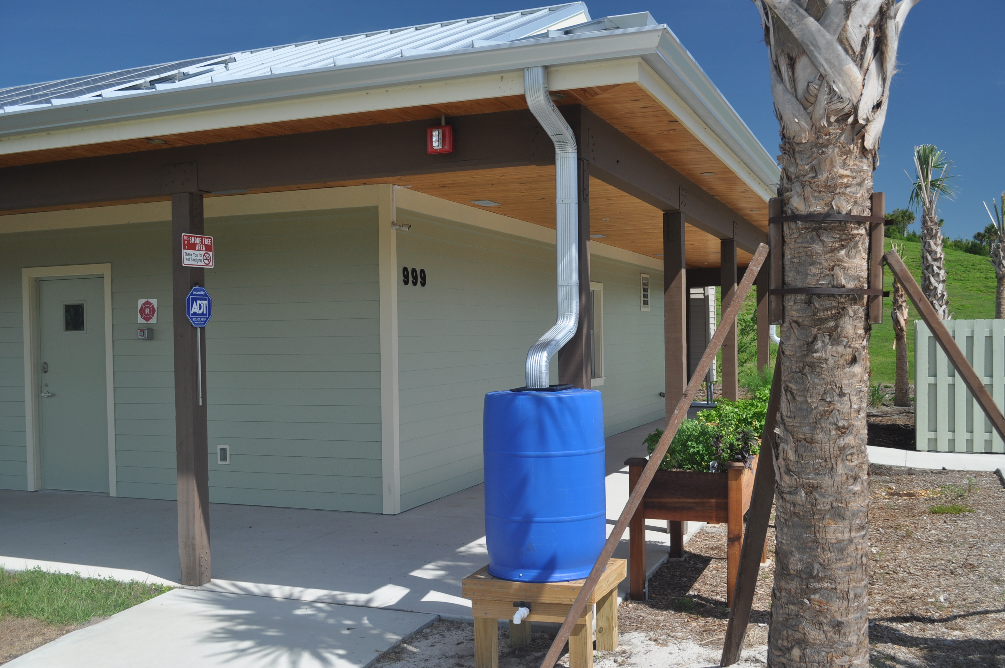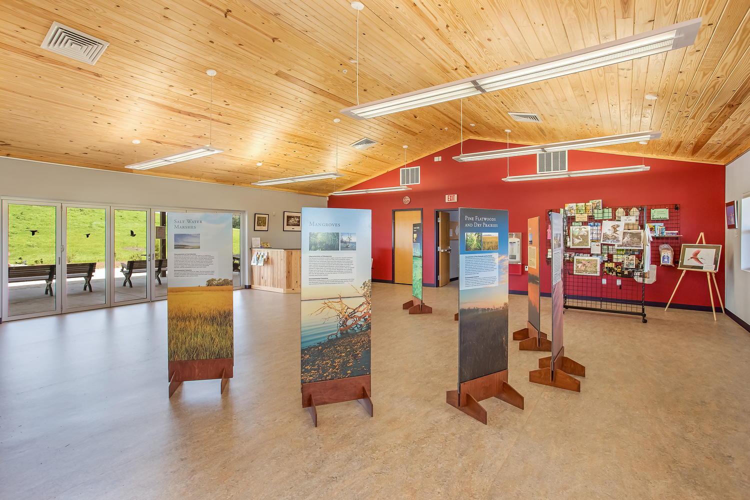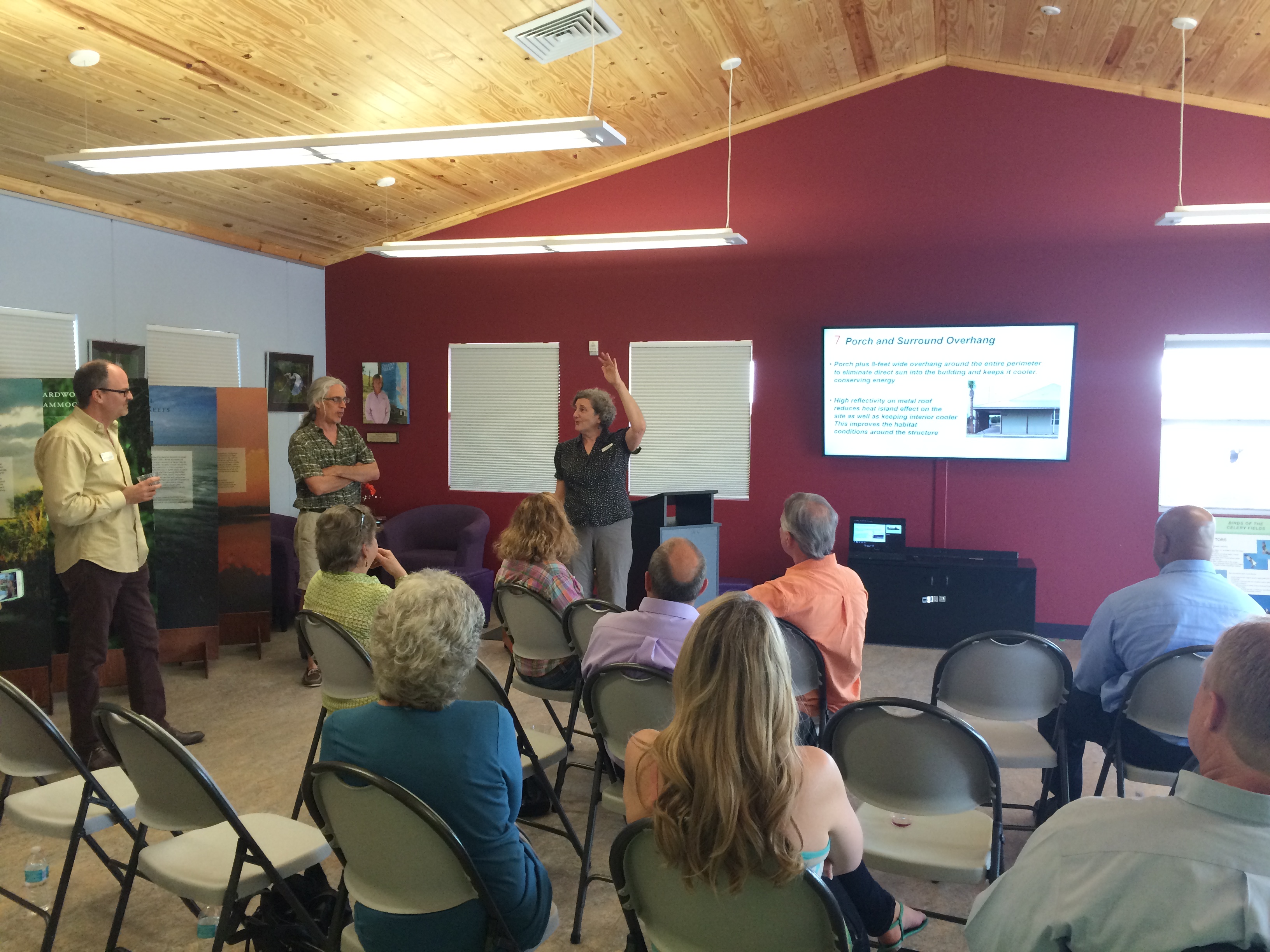 The building is situated on the public access edge of the acreage to minimize any disturbance to the fragile ecosystems of the preserve and encourage the birds and wildlife to come as close as possible to the Center. The exterior building envelope is Insulated Concrete Forms (ICFs) with insulted, low-e windows. Solar panels are used to provide more onsite energy than the building consumes. Exterior lighting is carefully controlled so as not to disturb the natural circadian patterns of the wildlife. A bird and butterfly garden will be surrounding the building on three sides and a bio swale is near the parking, contributing to water quality on the site.