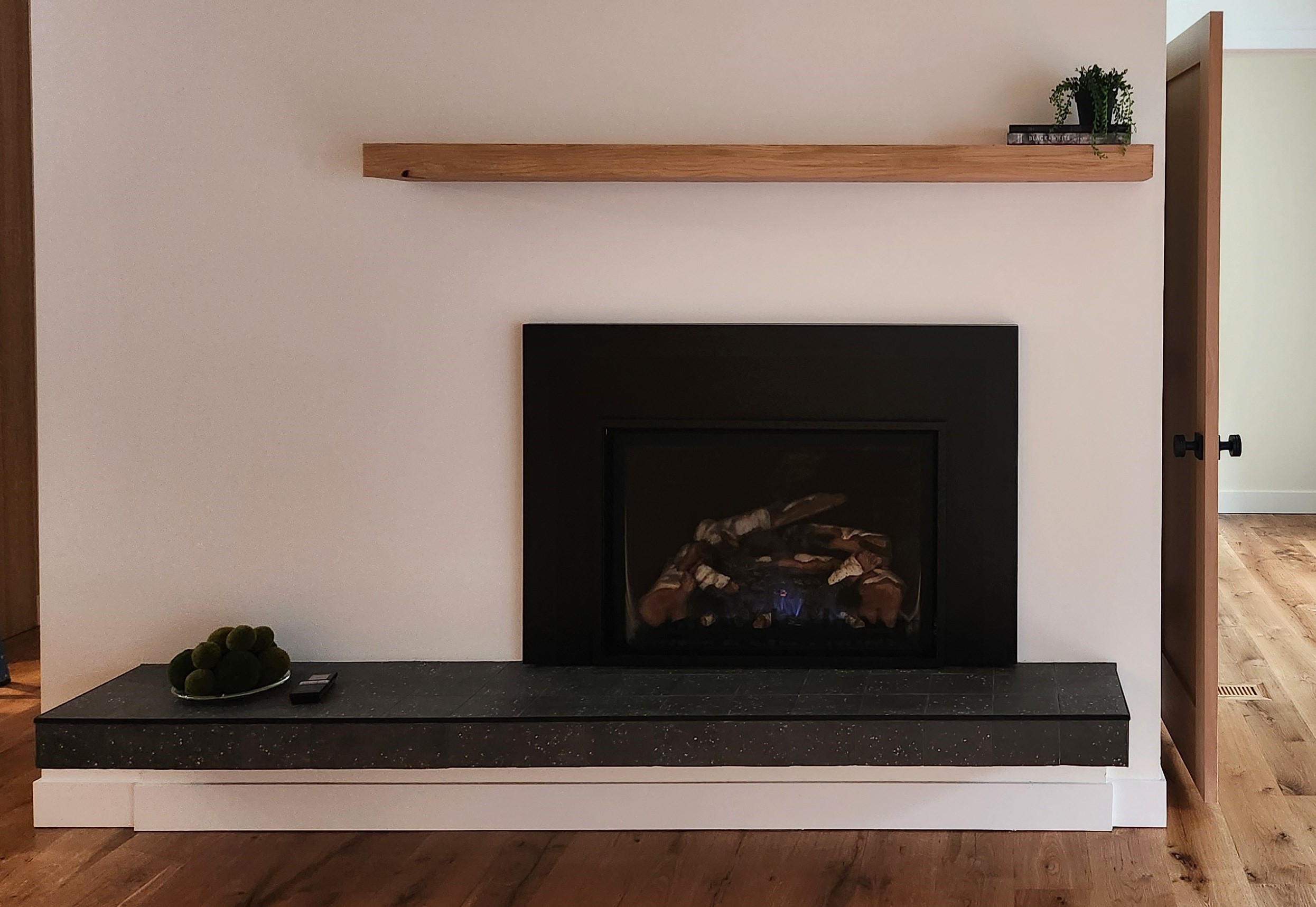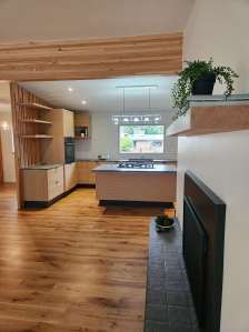 Old kitchen transformed to a modern open kitchen with fireplace in foreground