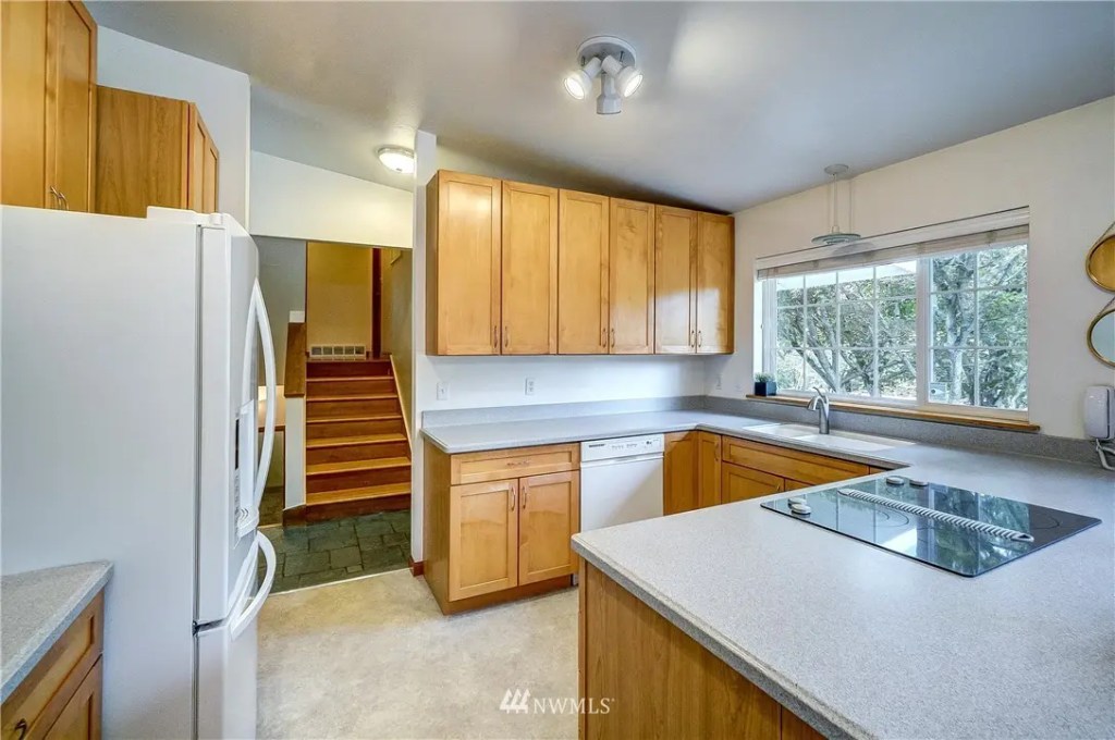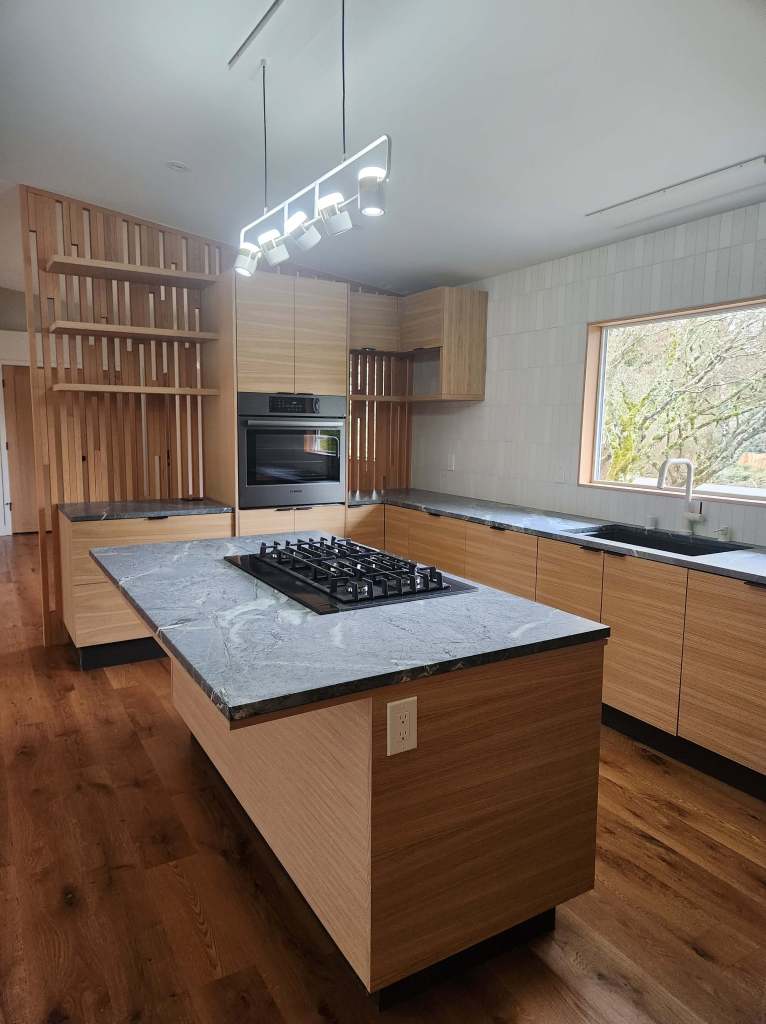 This existing, traditional, split level ranch home, located in the greater Seattle area has been transformed into a Danish modern interior. Goals included opening up the interior spaces to create a flow between various functions, visually connecting the upper bedrooms level to the main living level, updating the exterior front entry of the home, a new modern kitchen, updating finishes in simple wood and steel components to provide a completely new look. All completed project photographs were provide by Maltom Inc., the General Contractor for the project. (Their contact info is below)