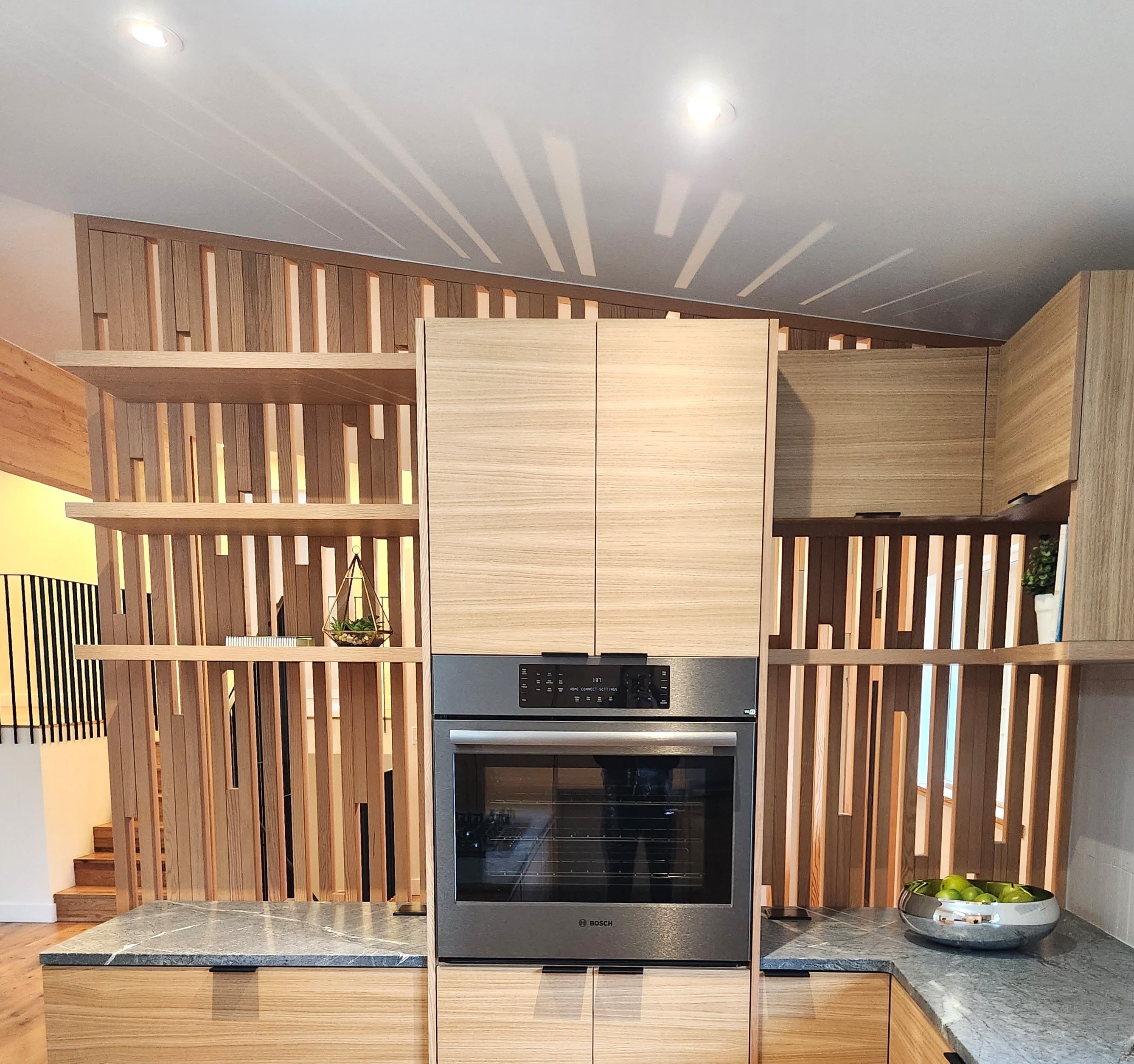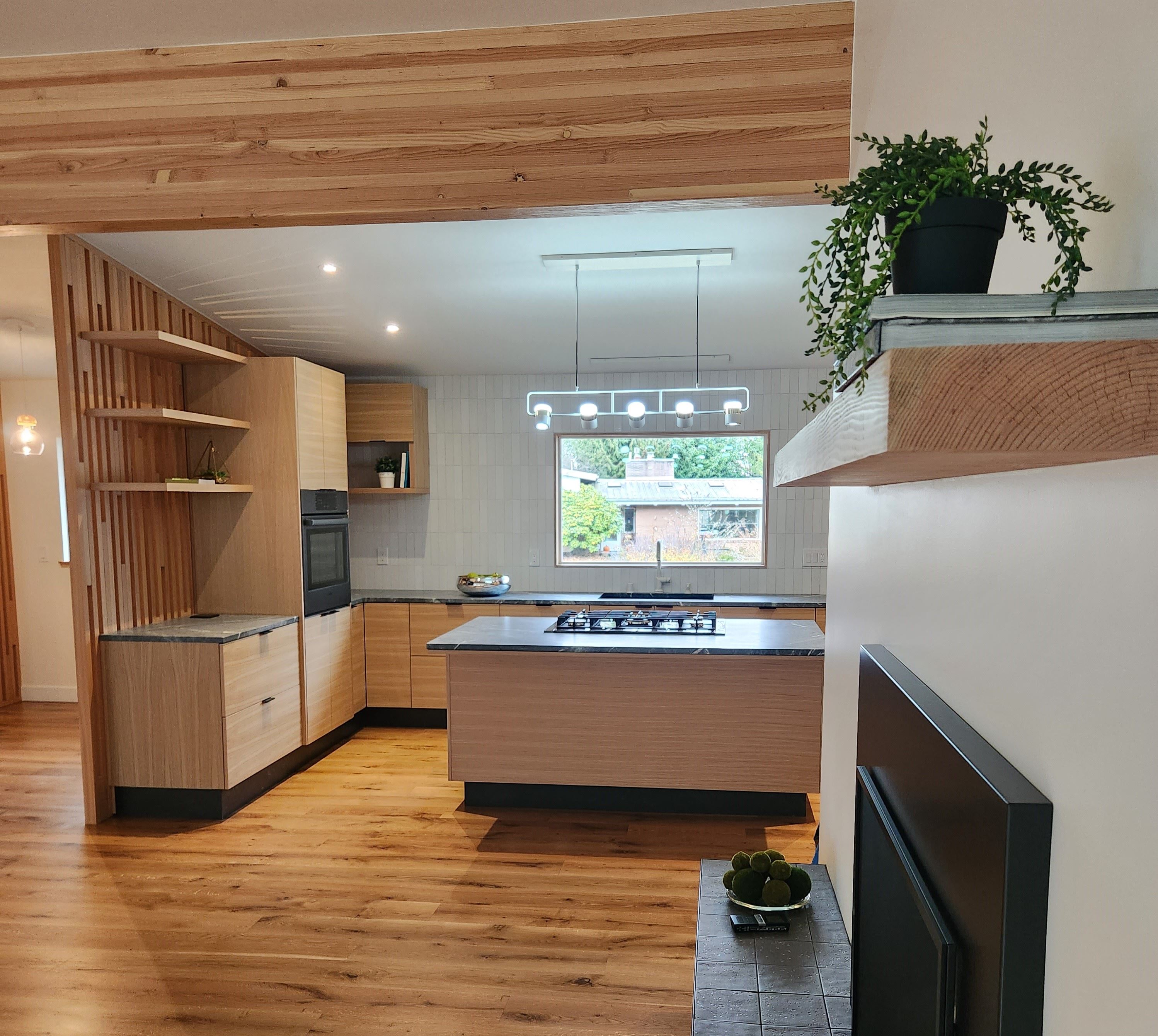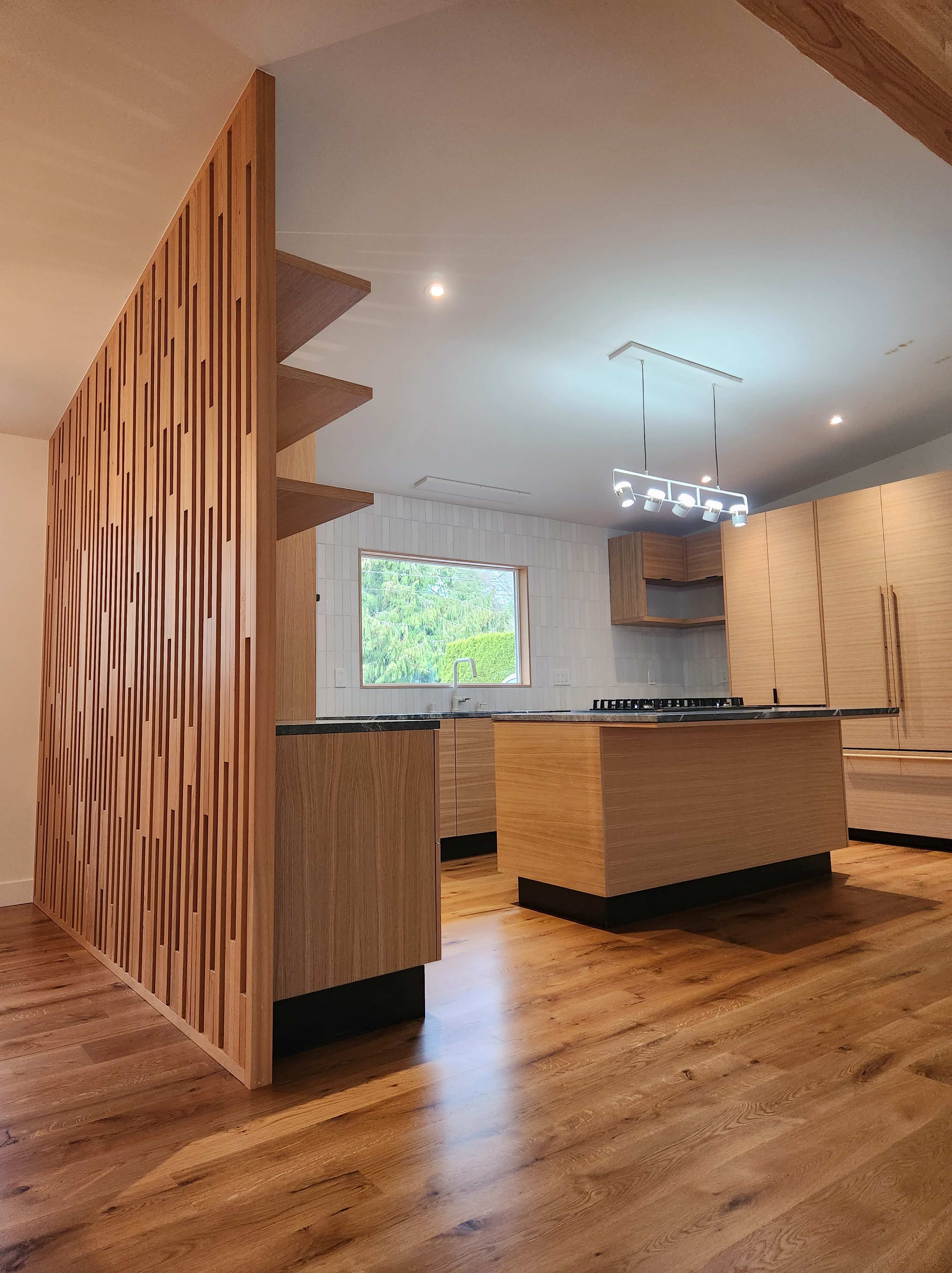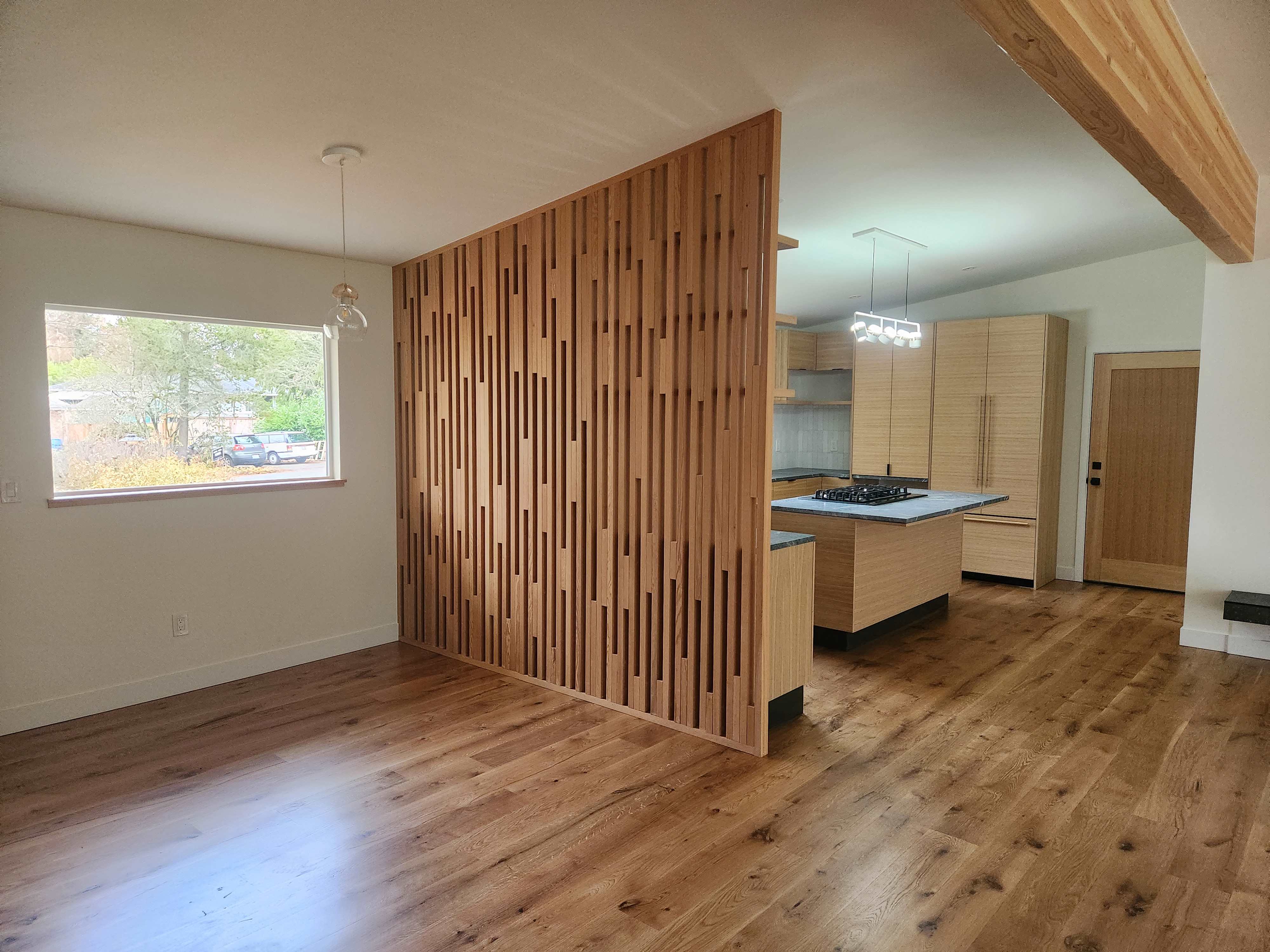 Old kitchen transformed to a modern kitchen open to great room. Wood screen separates kitchen from entry.