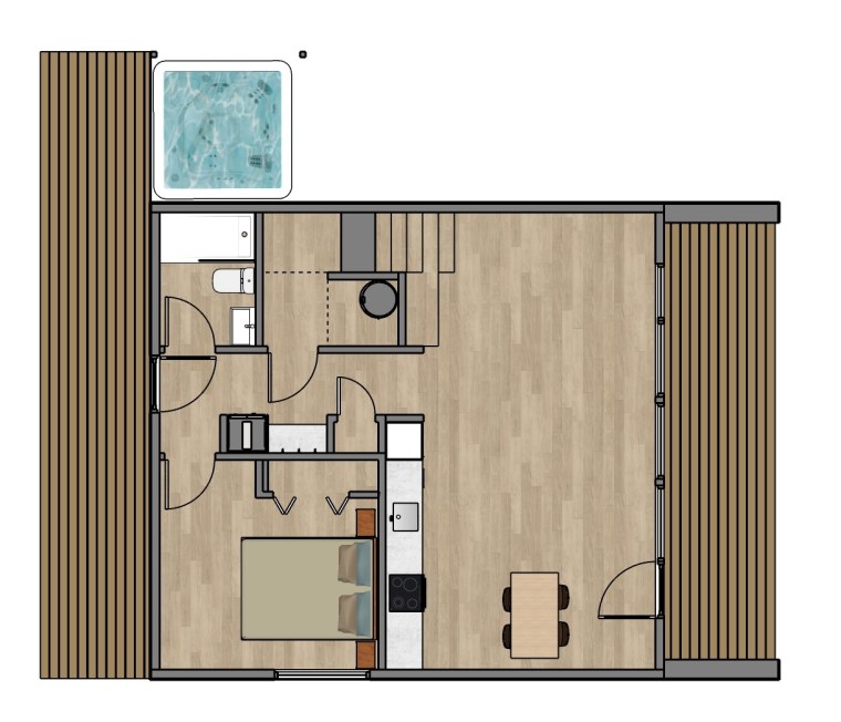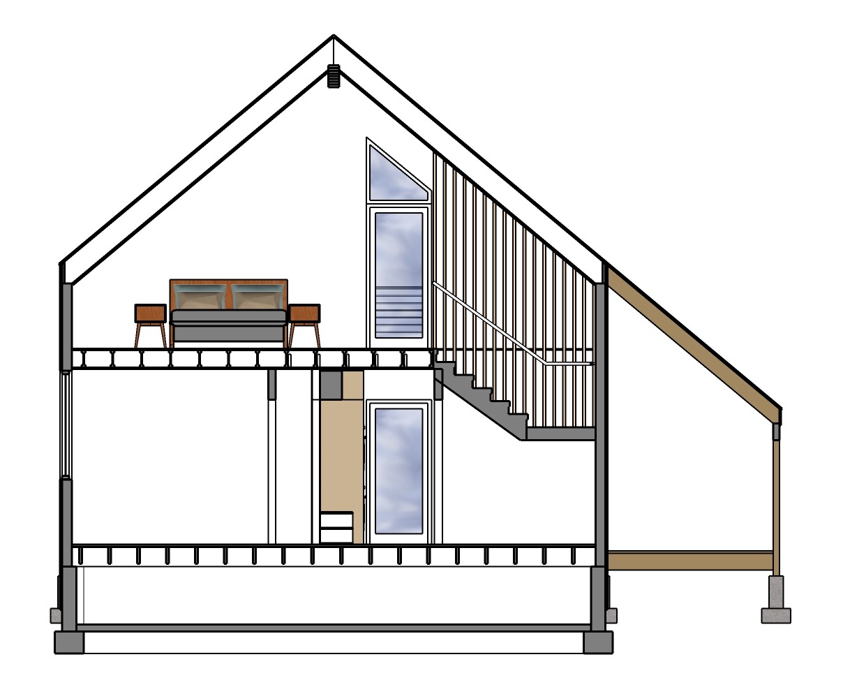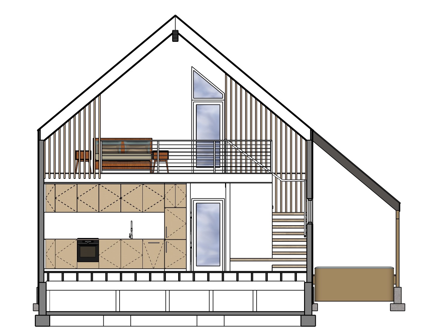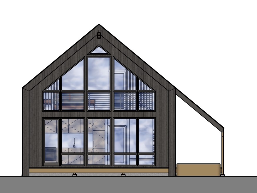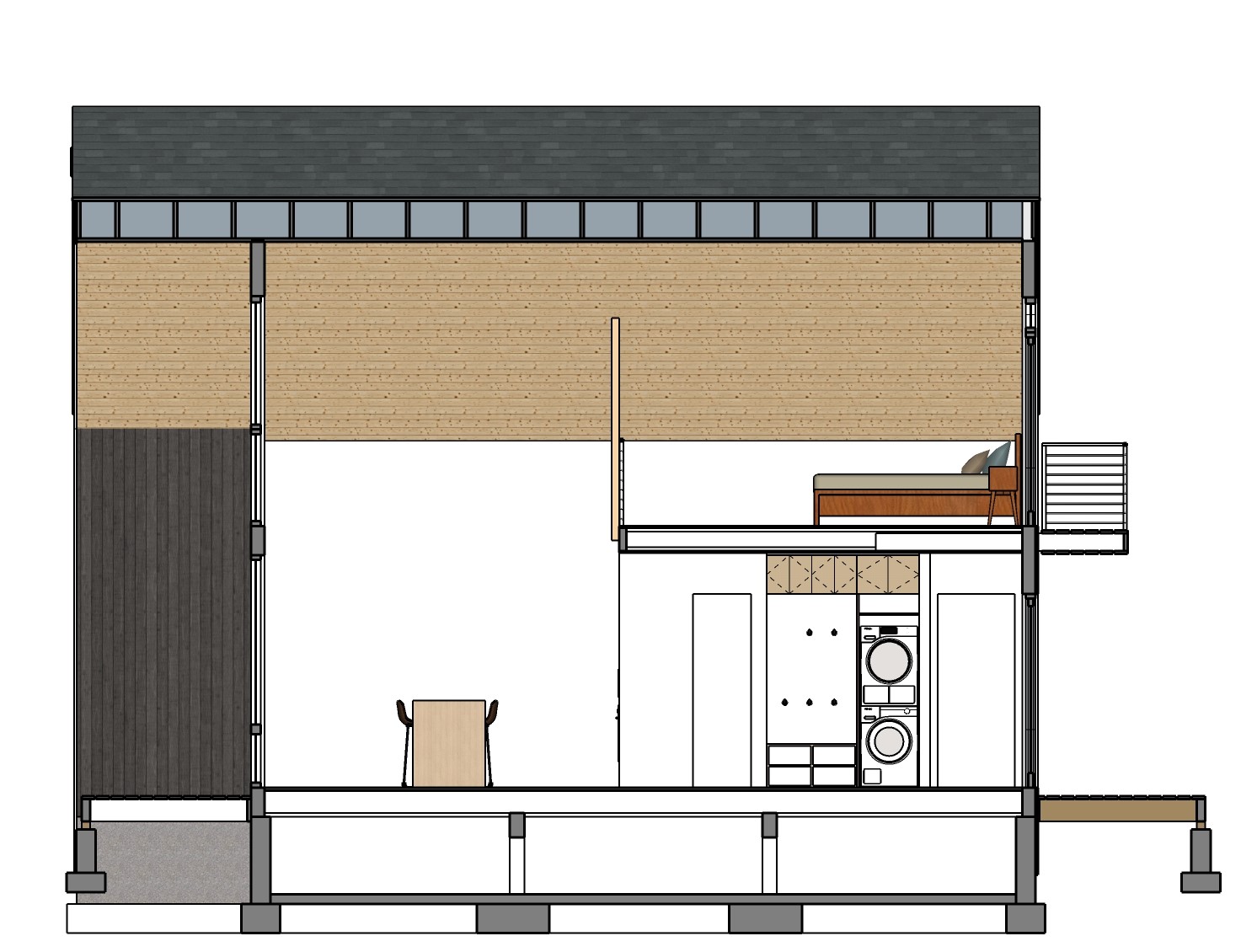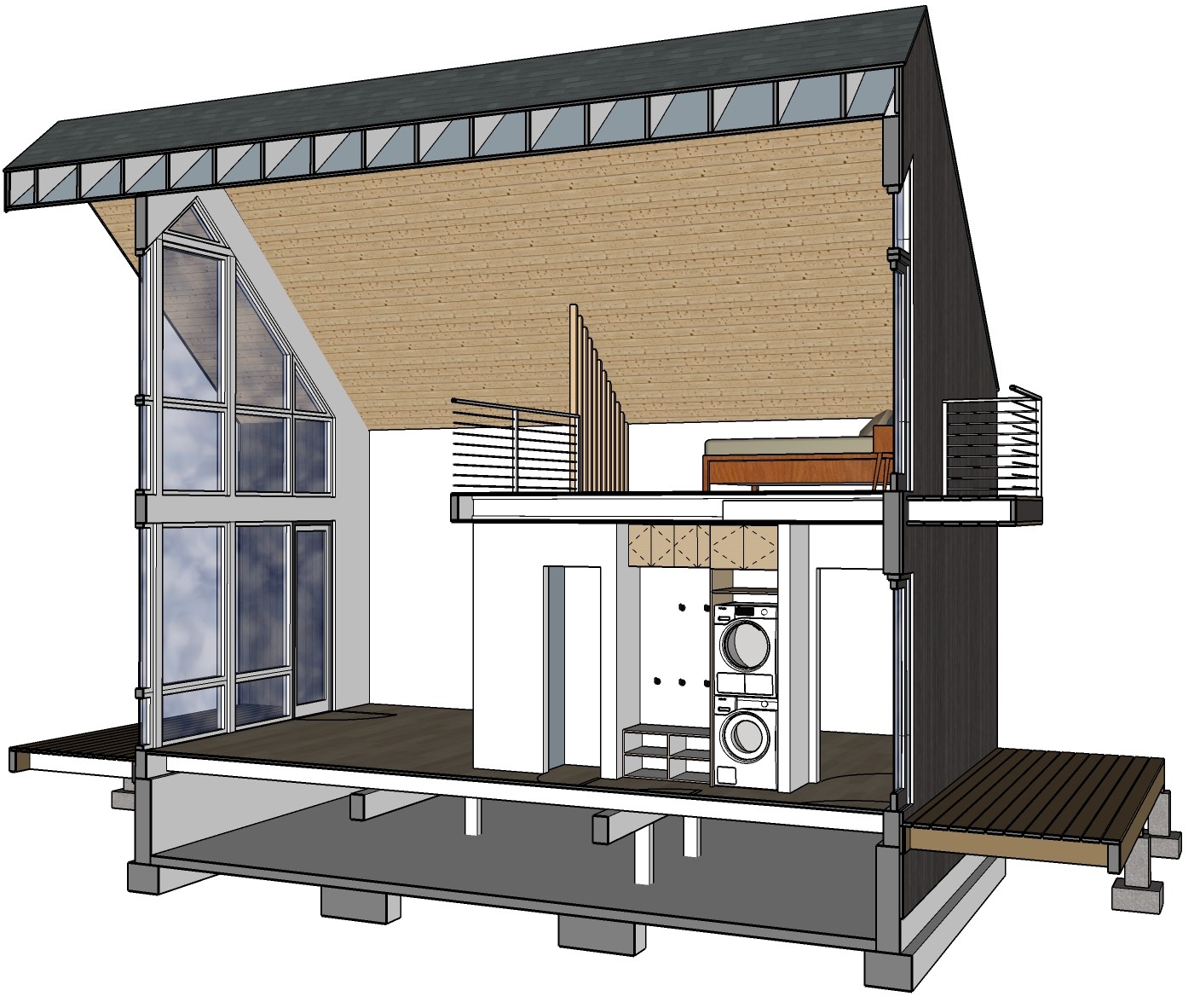 Introducing our Modern Scandinavian Cabin Design. Whether lakeside, in the woods, on a mountain, or anywhere with a view, this 1000 SF modern cabin will provide warmth and comfort so you can reconnect with nature. Features include a vaulted ceiling over the great room and loft area, a full wall of windows to capture the view, decks, porches and even a covered outdoor hot tub is accommodated. It is 2 bedrooms and 1 full bath, and an amazing mudroom with washer dryer and storage for your outdoor gear. This is a prototype that is ready to be customized to meet you needs and adapt to your site. It is initially intended for US climate zones 4 and 5, but can be adapted to go anywhere you want to be.