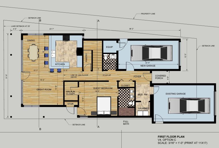 - Split one car garages (see plan below) are necessary because there was an existing 1 car garage that was non-conforming with current zoning (it is too close to the street).