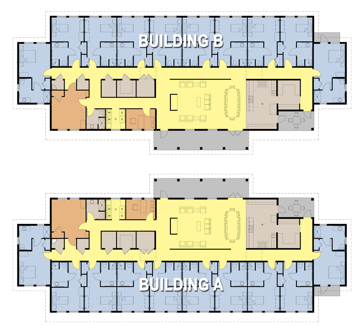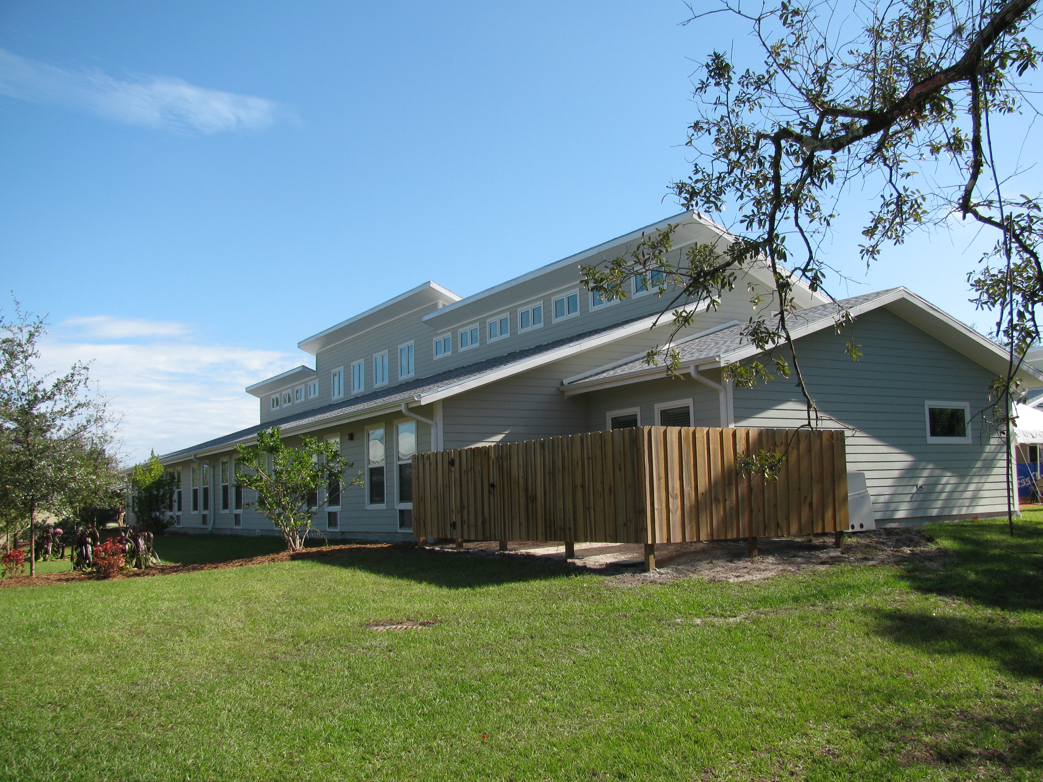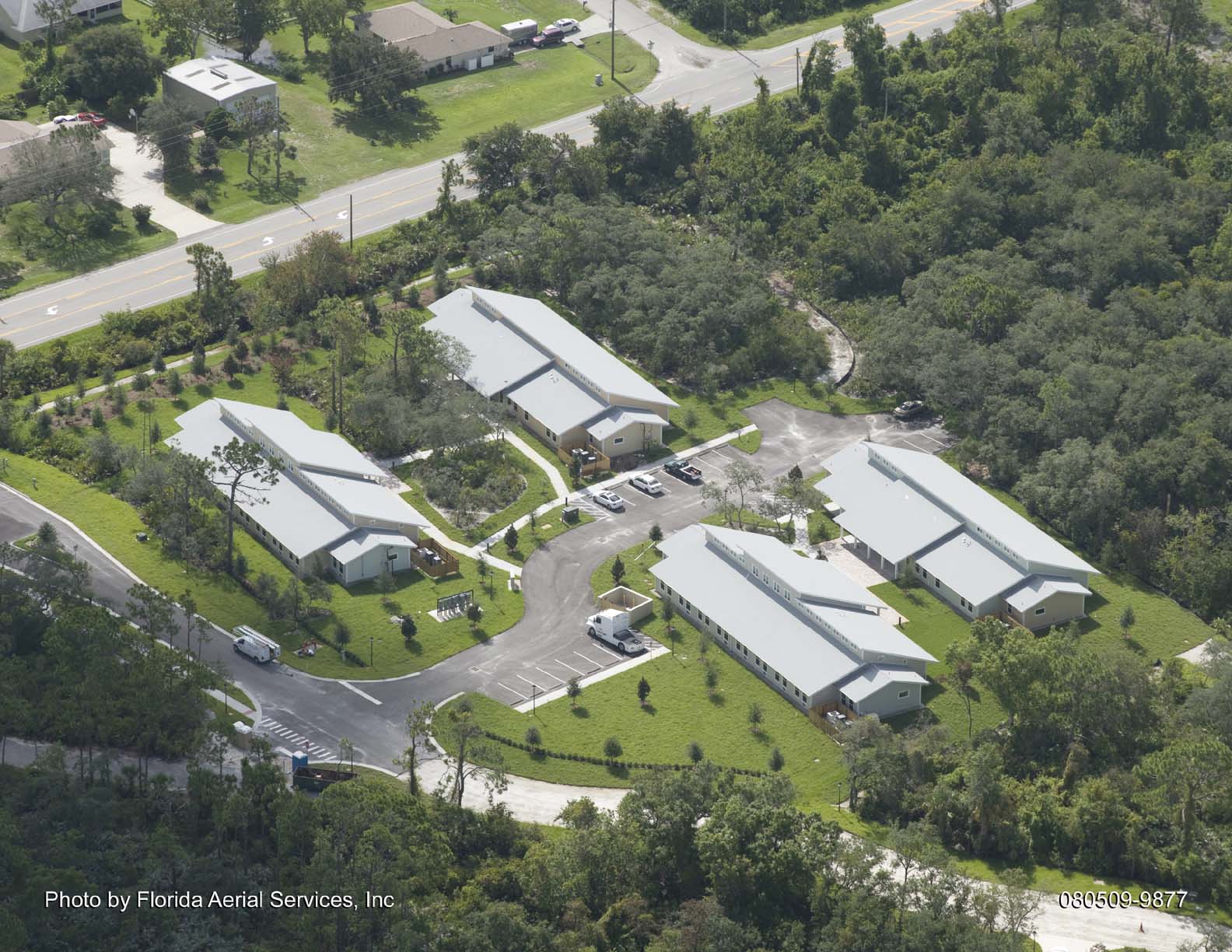 By the River, located on Florida’s Treasure Coast, is an affordable senior housing development established to serve the needs of the frail elderly and disabled. Built along the Roseland Road Corridor in Sebastian, By the River offers unique life enhancing programs and in-home health services. Housed on over five acres of pine forest in close proximity to the beautiful St. Sebastian River, the green design ensures that every resident has access to the natural environment. In keeping with respect for our surroundings, By the River is built and operated in an eco-friendly, low-impact approach. Creating a campus like atmosphere the four 6,000 sf buildings have 1 private bedroom suites, a shared living area, dining room, commercial kitchen, activities space, laundry and administrative offices. The project was designed with sustainable features throughout, including proper building orientation, use of natural daylight, reduced solar heat gain, energy efficient cooling, low VOC materials and finishes and instant hot water heating.