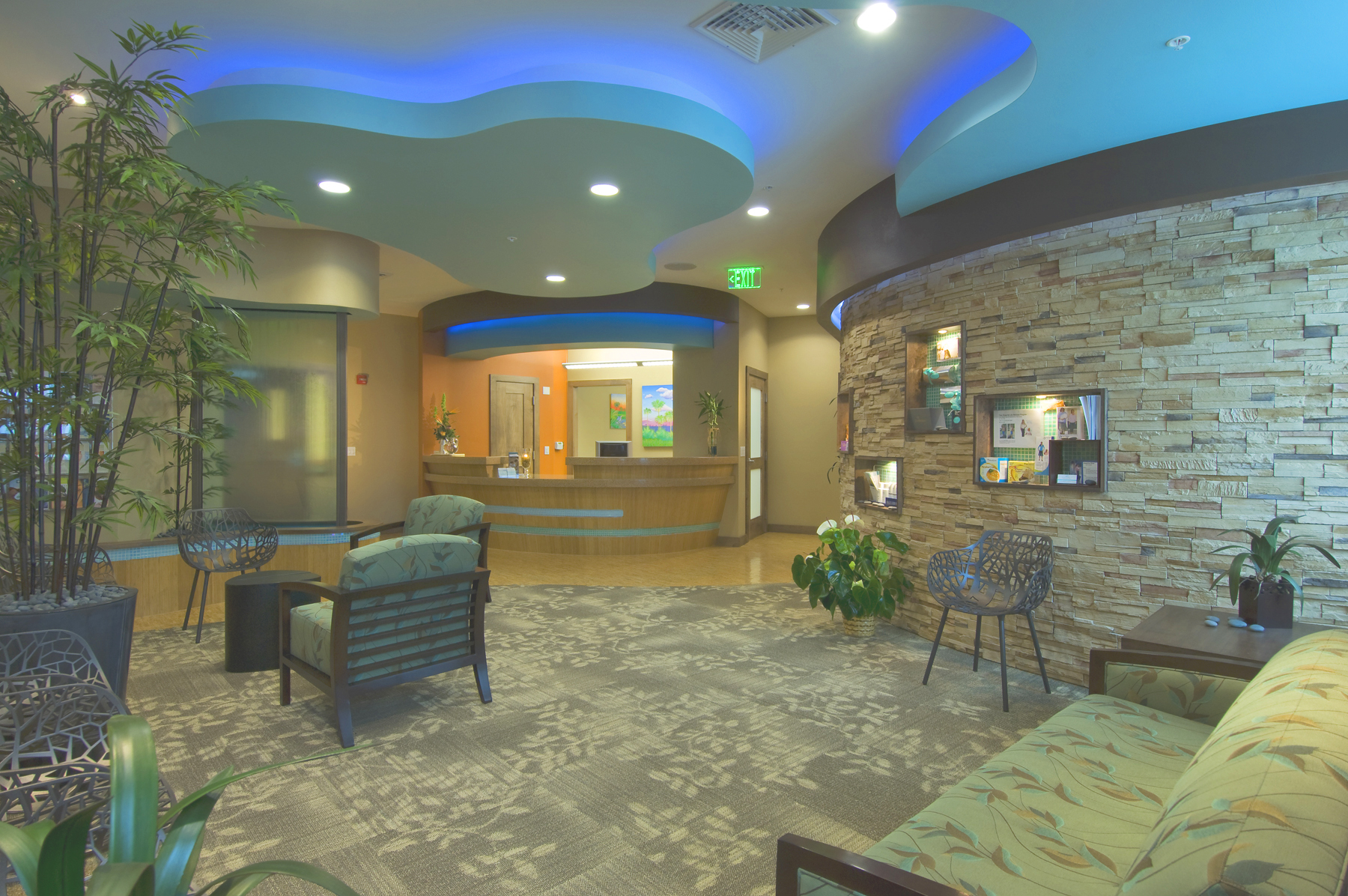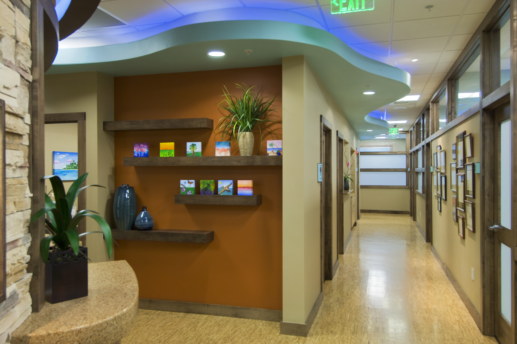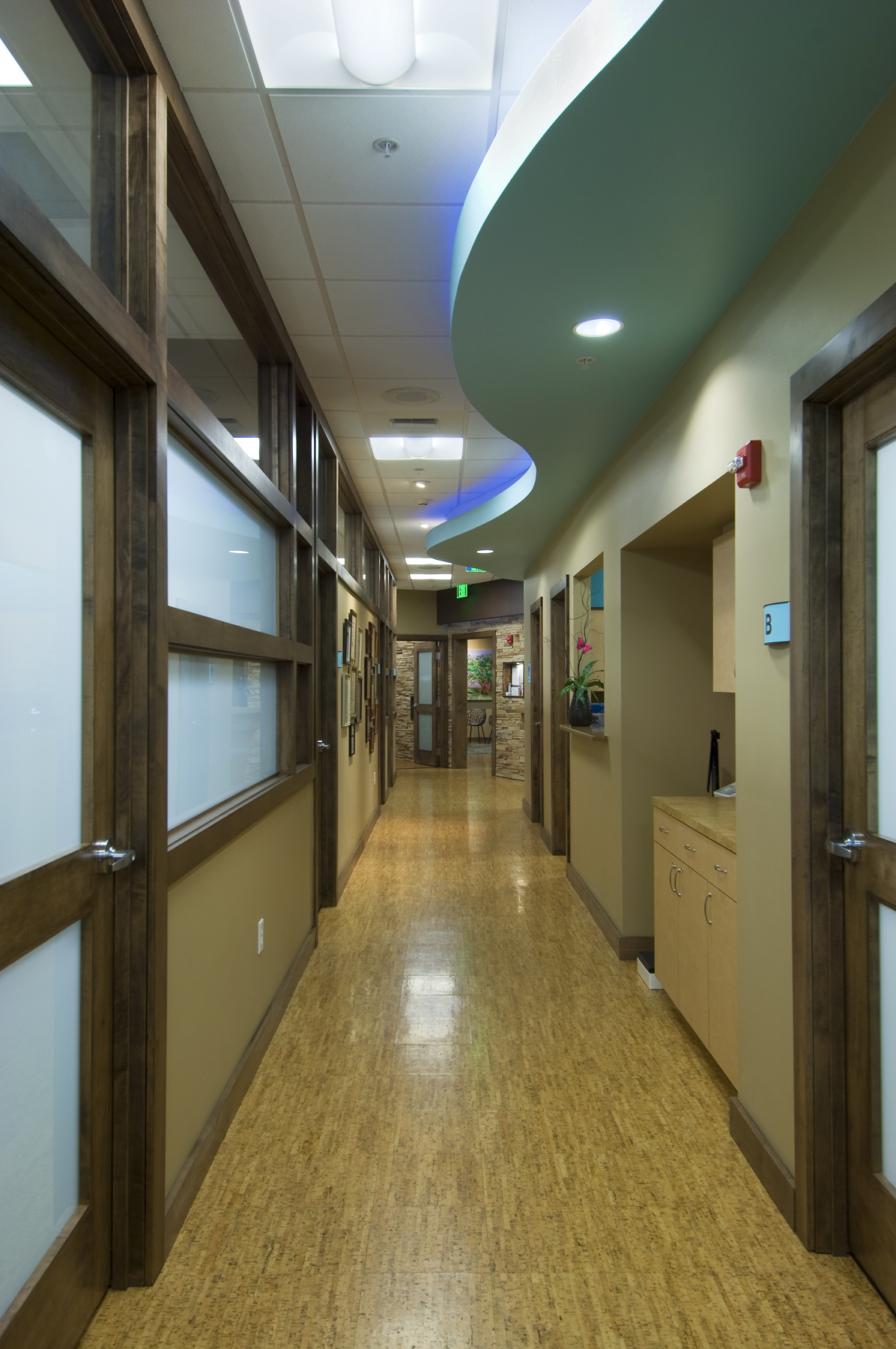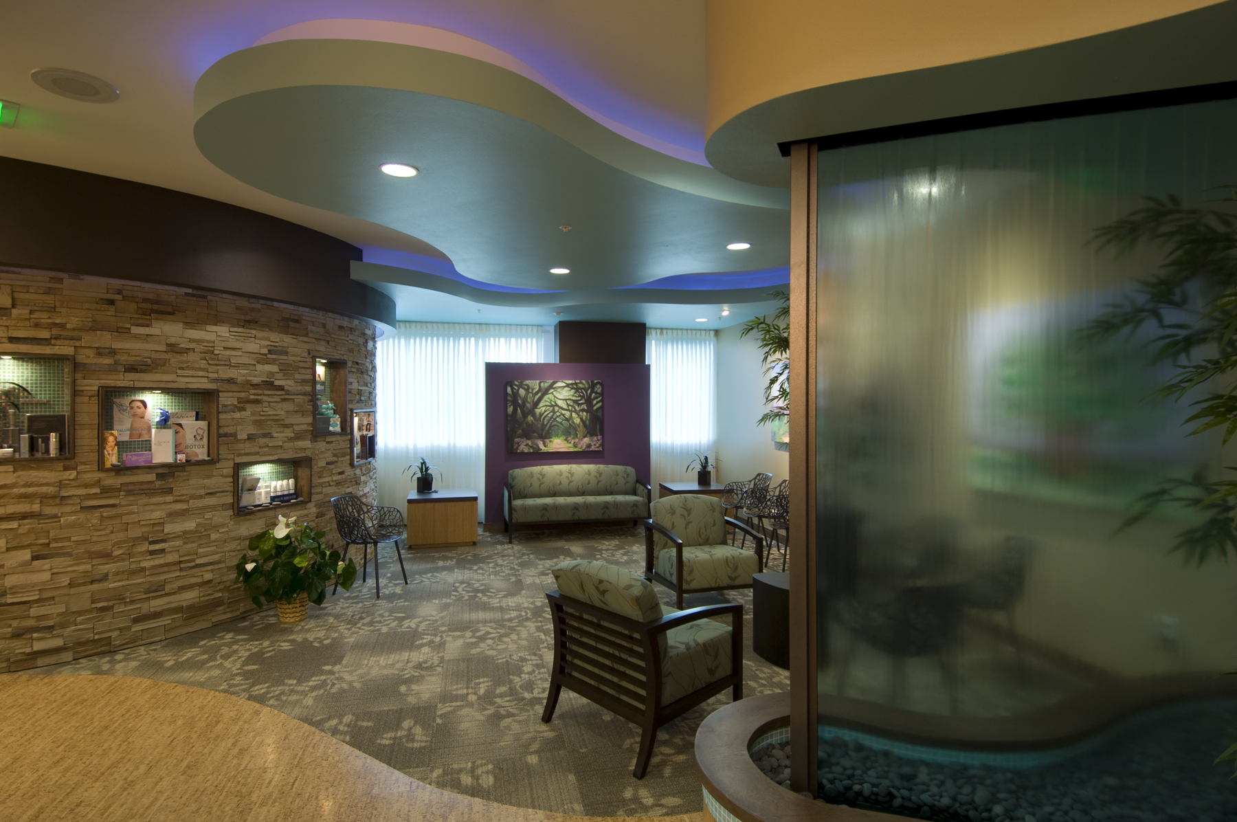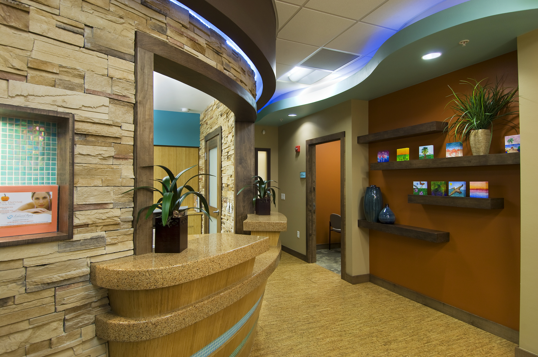 The clients for the Lakewood Ranch Plastic Surgery project envisioned a luxurious oasis to offer unparalleled amenities in a relaxing and rejuvenating environment. The tranquil and organic design of this facility allows one to escape to one of 5 exam rooms, a procedure room, four offices, reception/lobby and checkout, and a staff break room. The office is shared by two physicians, with room for future expansion. The project has earned a LEED-CI Certified designation with the U.S. Green Building Council. The office is located in the corner of a building allowing for daylight and views in the majority of occupied spaces. A glass wall is employed along the corridor to allow borrowed daylight into the corridor. White translucent glass is used in the lower portion of the wall, with clear glass above to provide ample light transmittance, while maintaining privacy. Thermal comfort was a concern; therefore adjustable diffusers are used in conjunction with zoned thermostats for the employees to control their comfort. Installed low flow plumbing fixtures and sensor faucets reduce water use. The project employs environmentally friendly finishes throughout the office. Rapidly renewable cork and linoleum flooring are found garnishing much of the project while the remaining areas have Green Label Plus Certified carpet tiles. Bamboo veneer over formaldehyde-free, recycled particleboard compose custom desks. Interior doors are solid maple with a low-VOC finish. Recycled glass tile adorn the walls in the restroom while low-VOC paint and adhesives are used throughout the remainder of the layout. Sustainable building practices are employed in all respects to allow patients to relax, refresh and renew without compromising medical care or privacy.