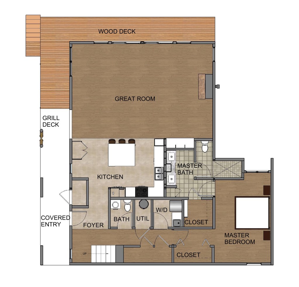 The main floor features the Great Room with fireplace and connections to a lakeside deck and covered grilling porch, and master bedroom suite with views to the lake is on this level
