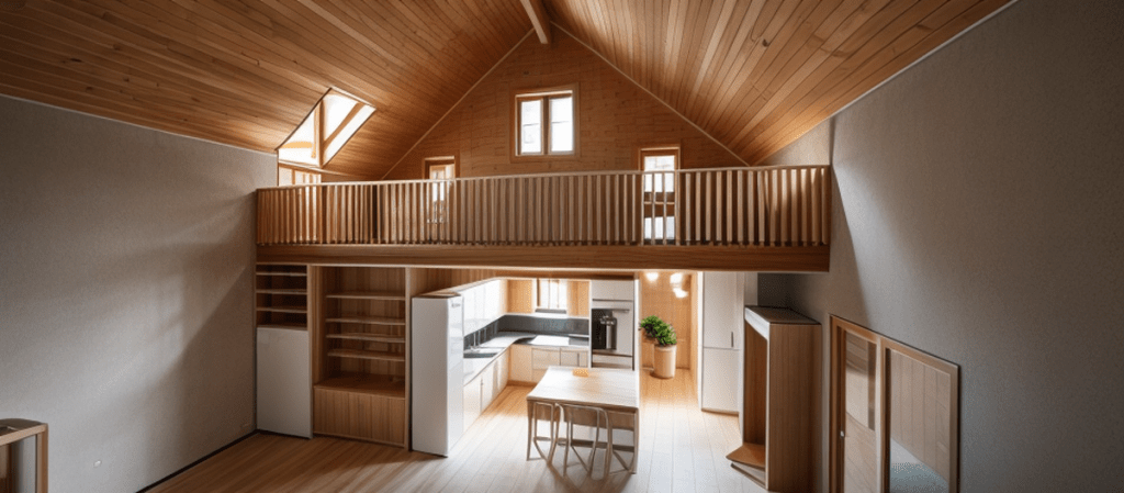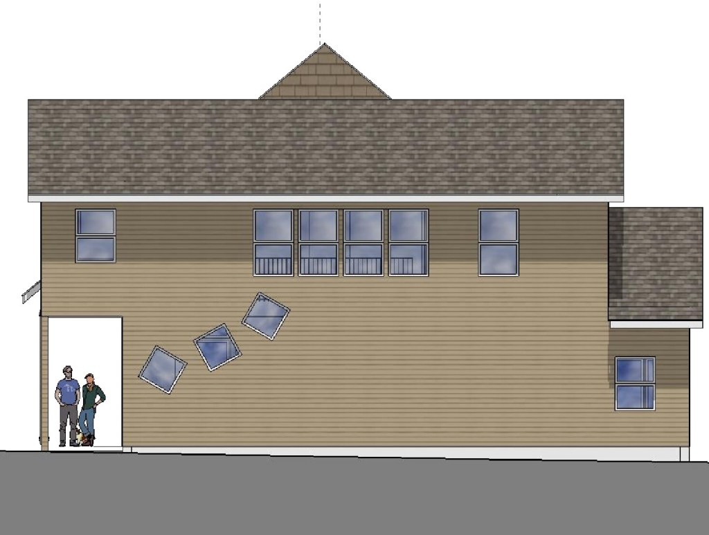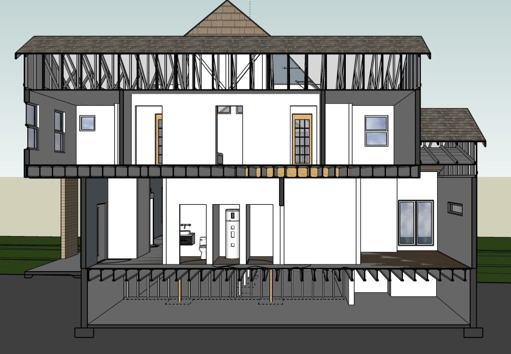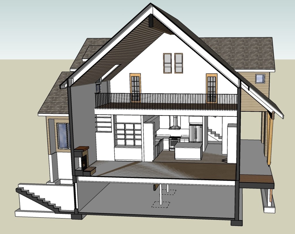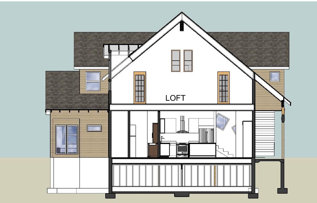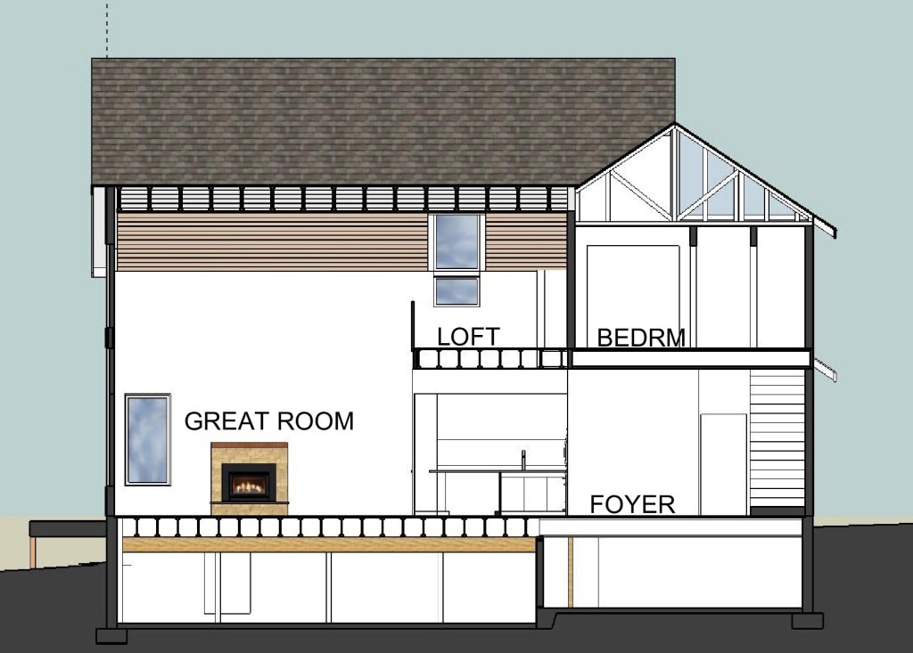 The 2nd floor has a substantial, open loft space that overlooks the great room. The 2 bedrooms are connect to the loft and share a full bath. The stairs are lit up with natural daylight that is shaded in the summer and allows deep penetration in the winter for both light and passive solar heat gain.