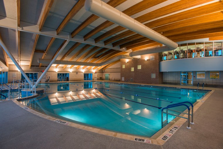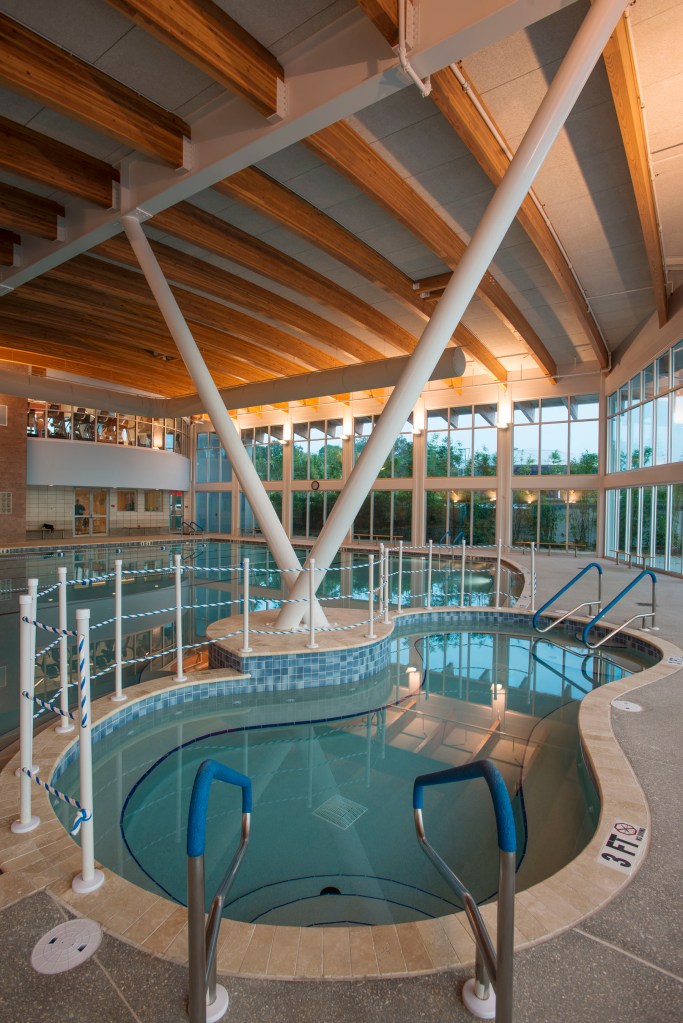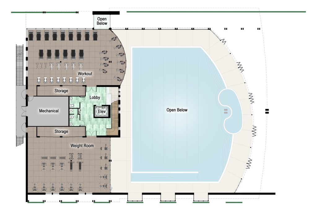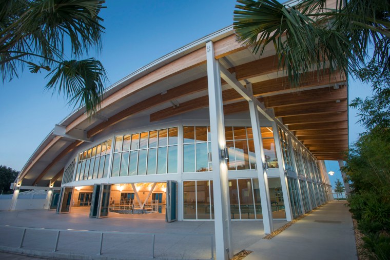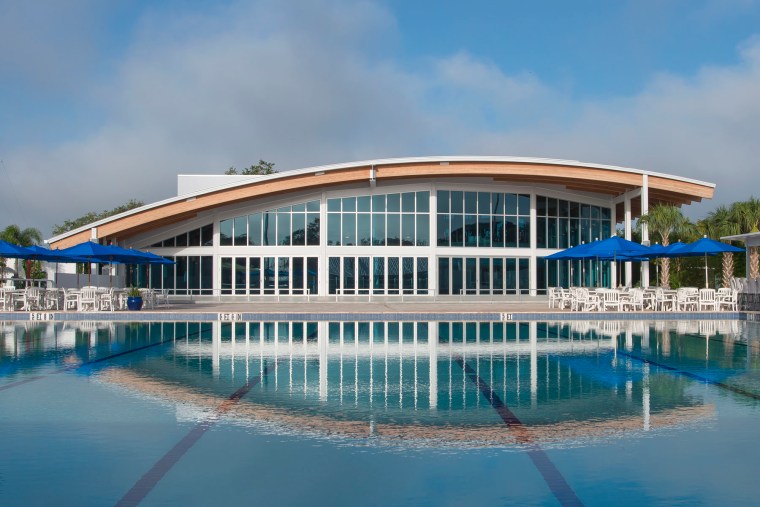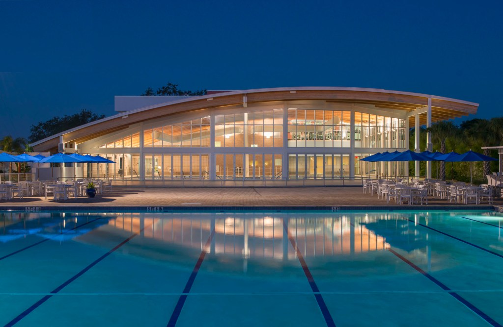 The LEED Gold Certified Lifestyle Wellness Center was designed for Florida based Sun -N- Fun RV Resort. Looking to attract the baby boomer generation, the resort sought to provide a higher class of services. The building is comprised of a therapy spa, an indoor 25 meter lap & therapy pool, second floor exercise rooms that overlook the pool, along with an aerobics studio, steam & IR sauna rooms, dressing/locker facilities and access to adjacent existing exterior pools. The building was designed to bring a mature contemporary aesthetic to the aging campus, while maintaining the tropical feel of the resort. A well known local post war modern movement help to provided a vocabulary framework for materials and structure. The resultant design creates a flow of space and form between the program elements,the hard clean lines of the masonry walls intersect with the curved wood beams and glass facade. Meanwhile a rhythm of steel columns lift the structure and unite the exterior spaces and guide occupants along a predefined path. One the project’s main goals was to connect to the existing exterior pool deck and create an “open” feeling, which was achieved with a span reducing ‘V’ shaped column supporting the roof structure and large glue laminated beams. Taking advantage of views to the east, a full glazed facade offers views to the existing exterior pool, while glazing on the north side provides copious amounts of natural light. In order to provide a physical connection to the exterior, three 20’ sections of the eastern facade accordion open allowing the indoor & outdoor pool decks to be combined on pleasant days and for events.